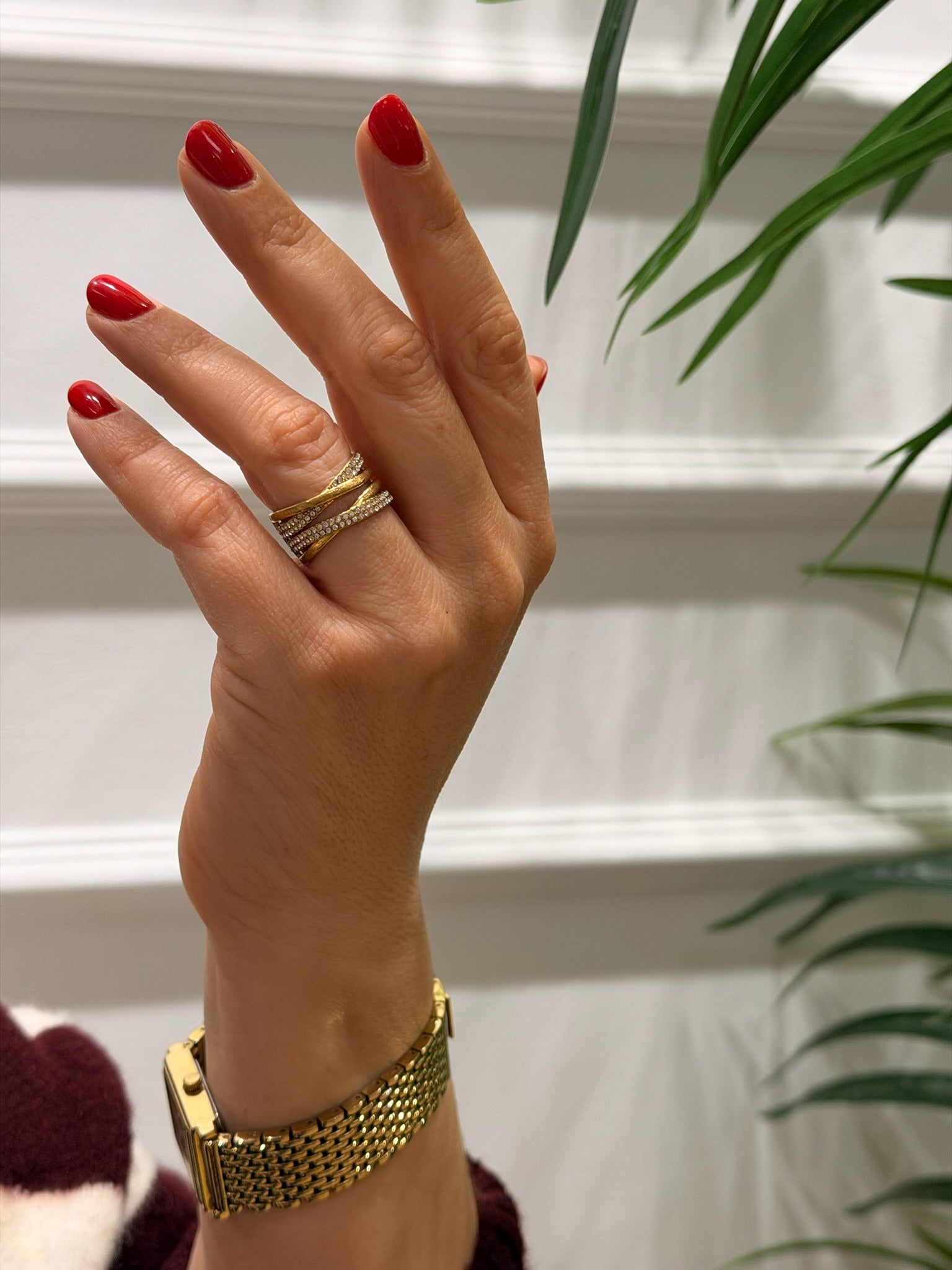 Anillo de diseño doble con líneas cruzadas y acabado dorado, decorado con pequeños cristales que aportan luz y sofisticación. Una pieza especial que destaca por su elegancia y su diseño moderno, perfecta para elevar cualquier look, tanto de día como de noche.