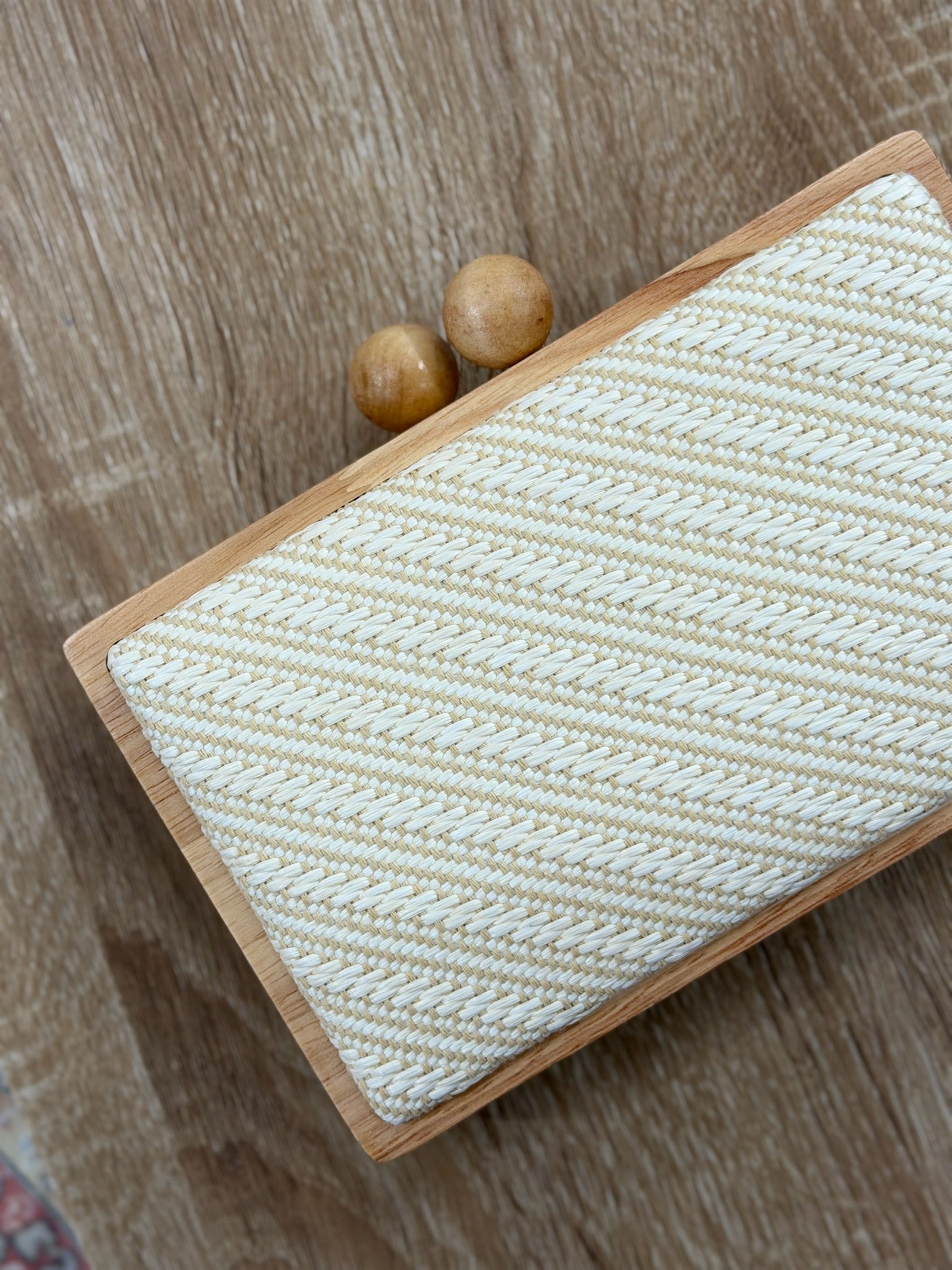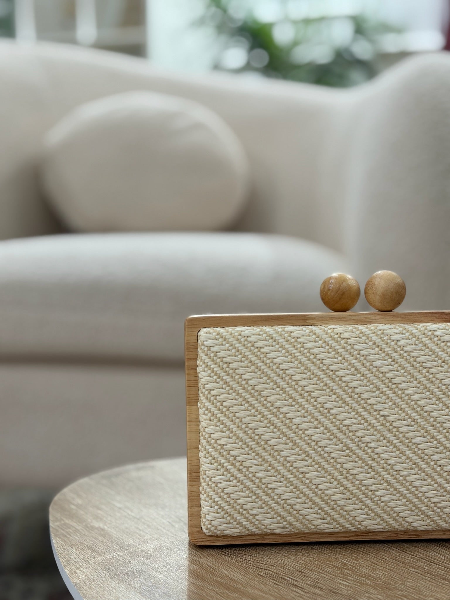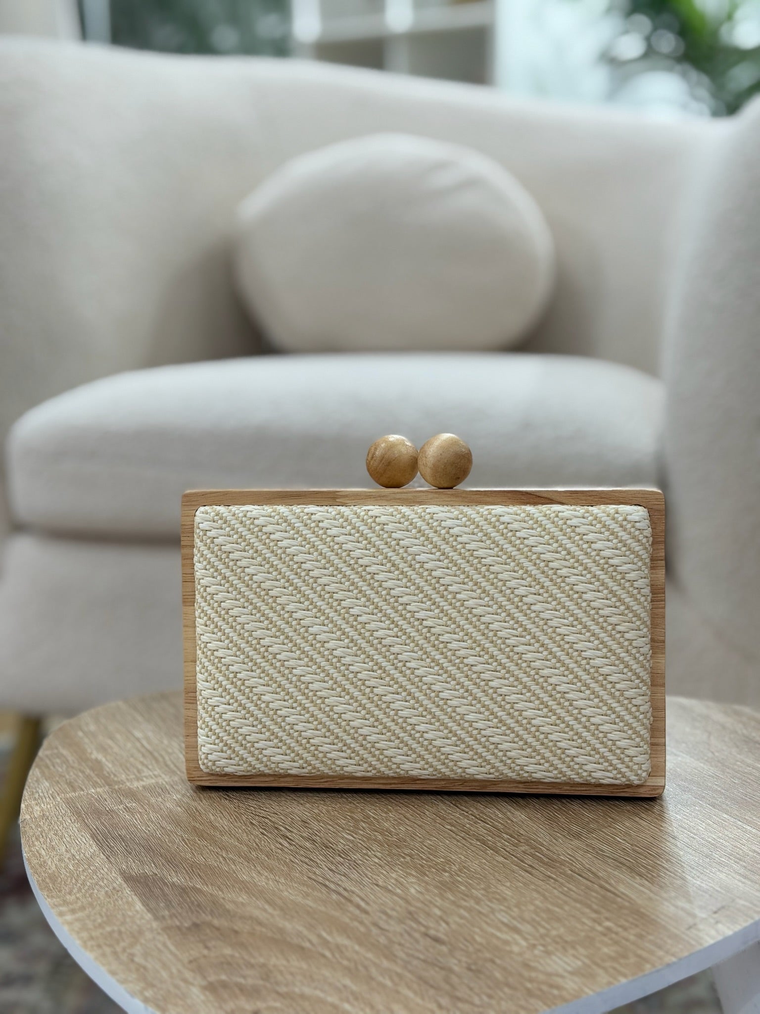 Un bolso elegante y atemporal que combina la belleza de las fibras naturales con la calidez de la madera. Su diseño estructurado con marco y cierre de bolas de madera aporta un toque sofisticado y muy especial, perfecto para completar looks de invitada en bodas, eventos o celebraciones.