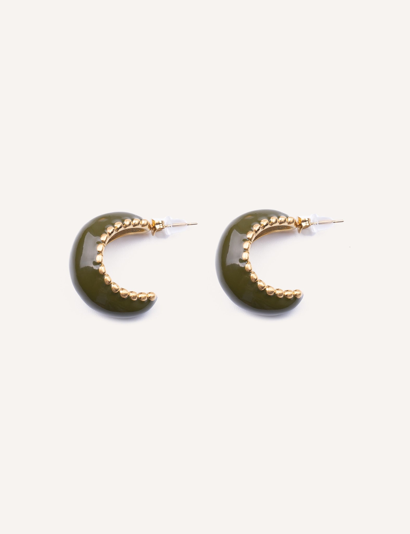 Pendientes de diseño en forma de media luna con acabado en tono verde brillante y detalle dorado, que aportan un toque sofisticado y diferente. Su tamaño es ideal para destacar sin resultar excesivos, perfectos tanto para el día a día como para ocasiones especiales.