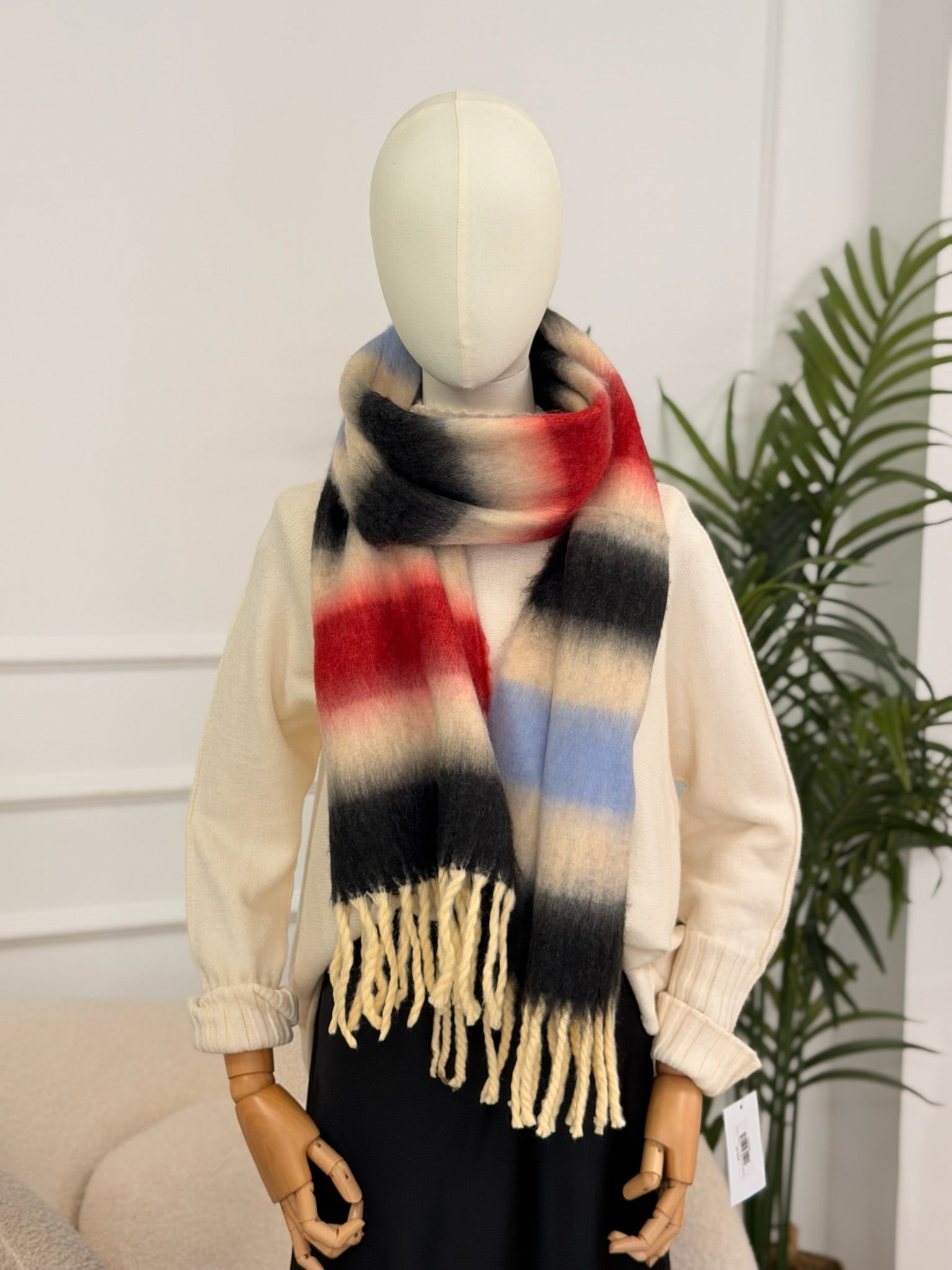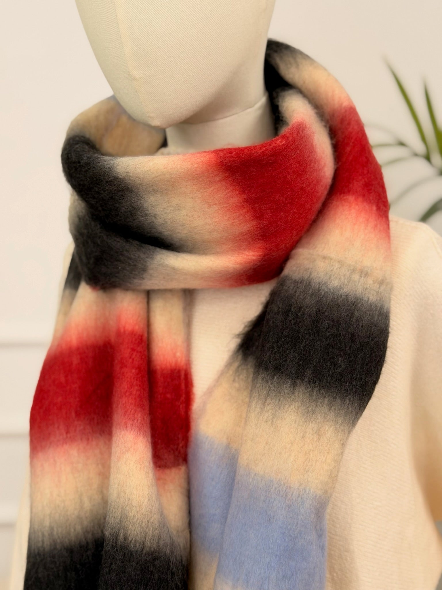 Suave, abrigada y con mucho rollo. Esta bufanda de tacto tipo mohair combina franjas en tonos rojo, negro, crema y azul que aportan color y contraste a cualquier look invernal.
