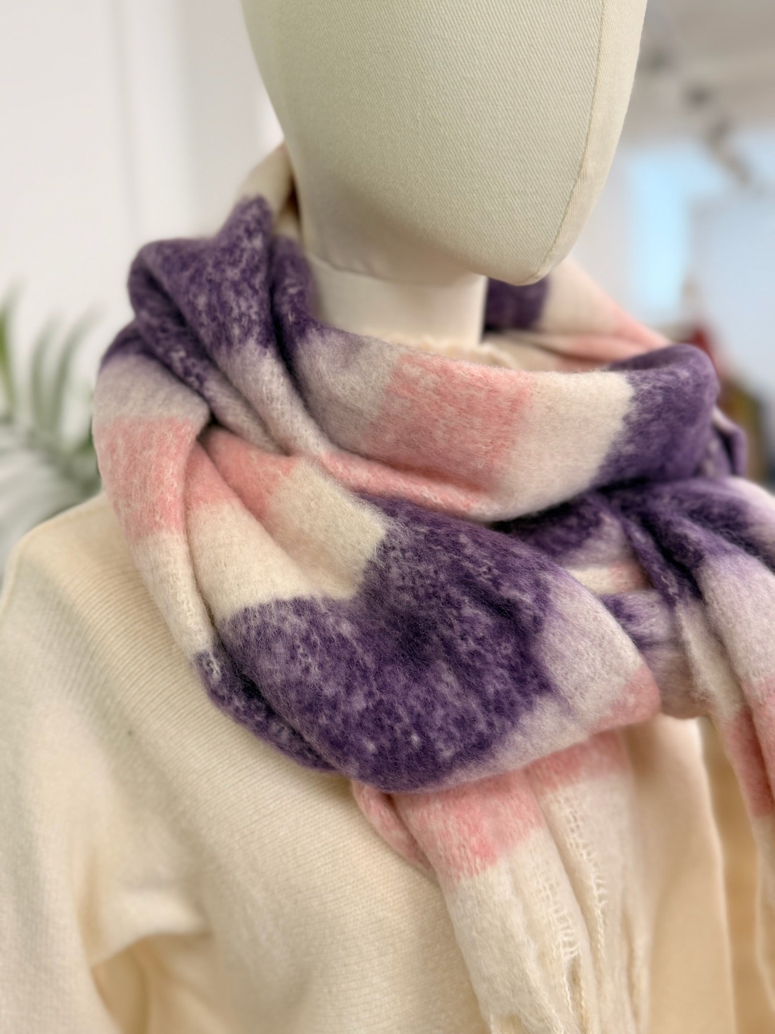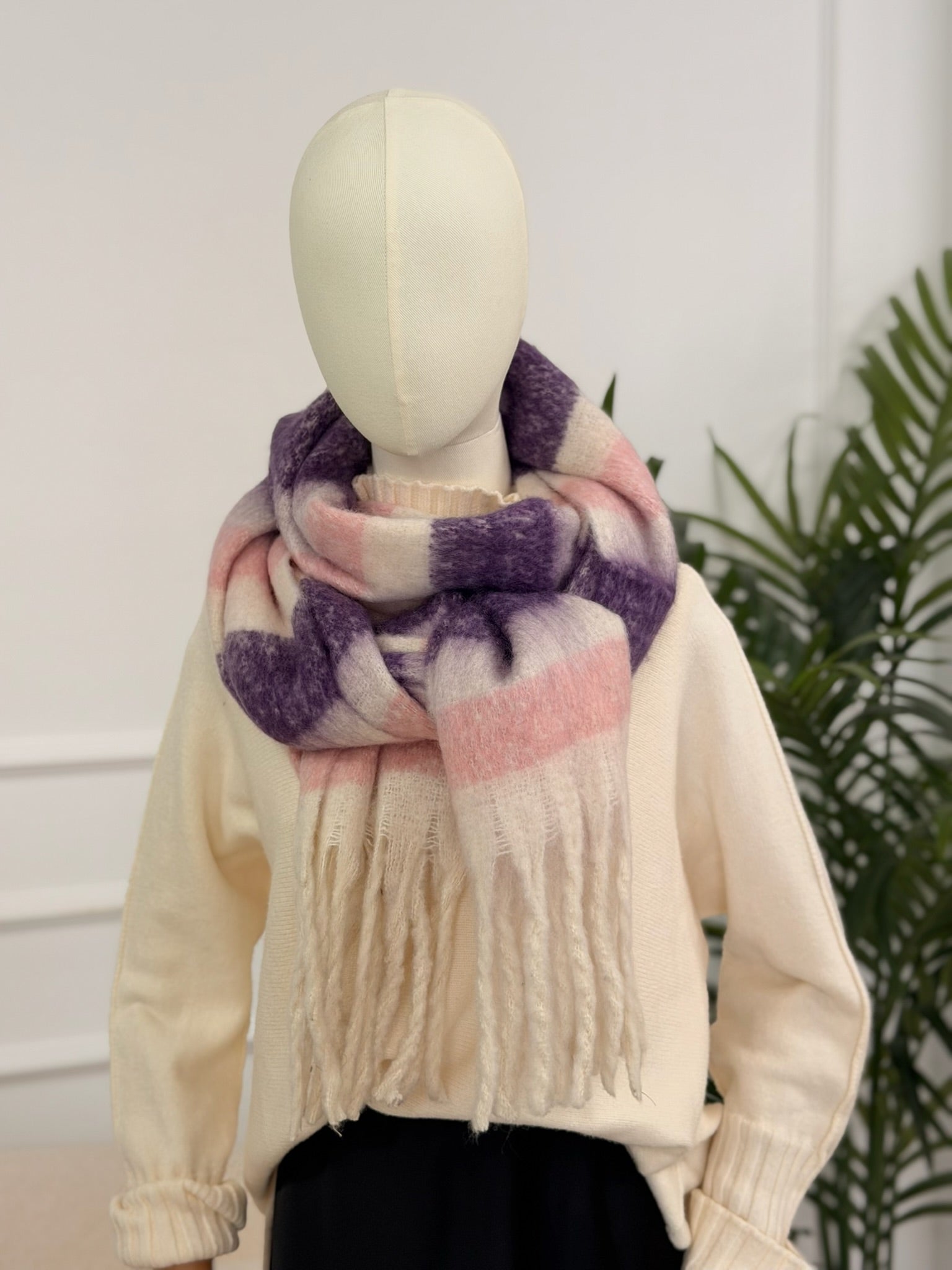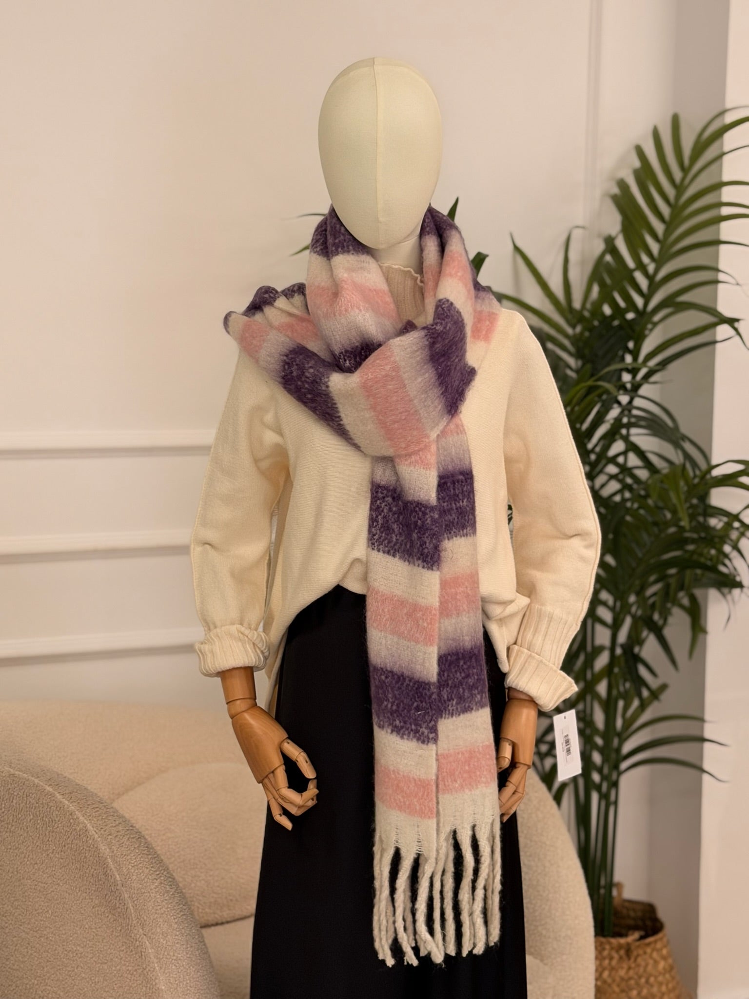 Ideal para dar un toque dulce y acogedor a tus looks de invierno. Esta bufanda de tacto suave tipo mohair combina franjas en lila, rosa empolvado y crema, perfecta para iluminar prendas neutras o total looks en negro.