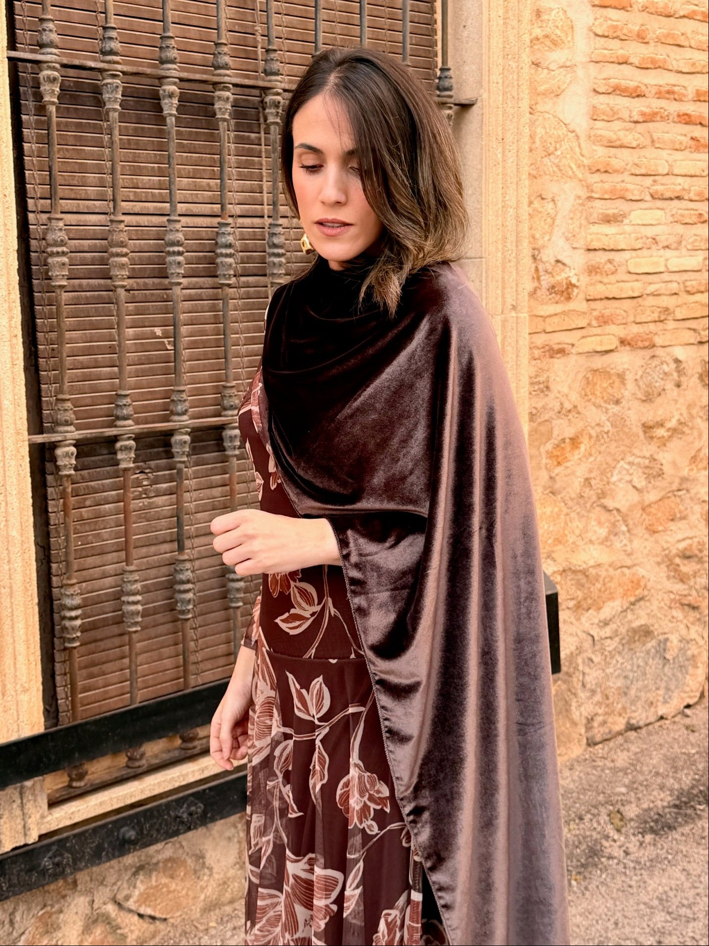Envuelve tus looks de invitada con la elegancia y calidez del terciopelo. Nuestra capa marrón es el complemento perfecto para vestidos de otoño e invierno, aportando un toque sofisticado y muy favorecedor.