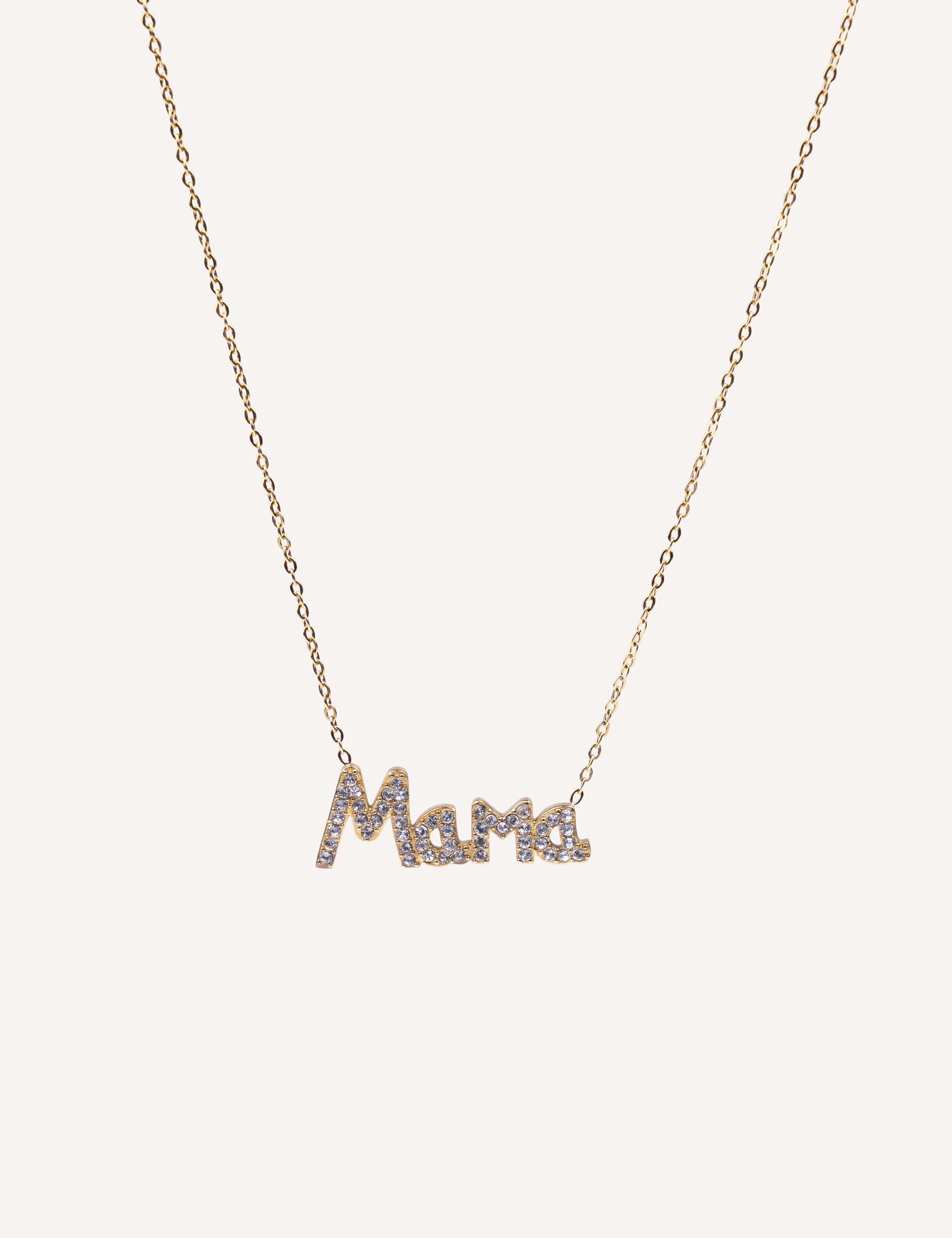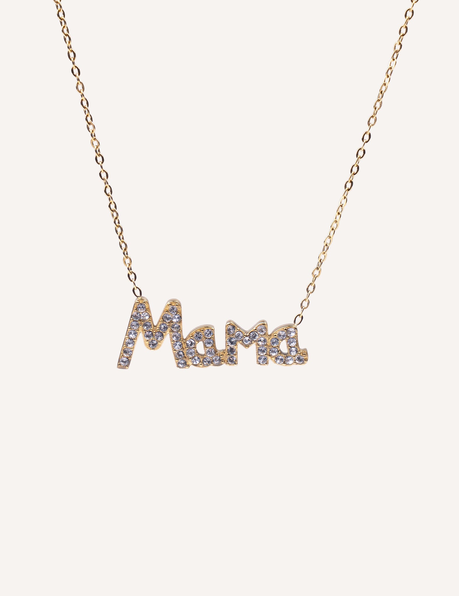Esta elegante gargantilla de acero inoxidable presenta un diseño moderno y romántico con las letras "MAMÁ" adornadas con pequeñas piedrecitas brillantes que aportan un toque de glamour sutil.