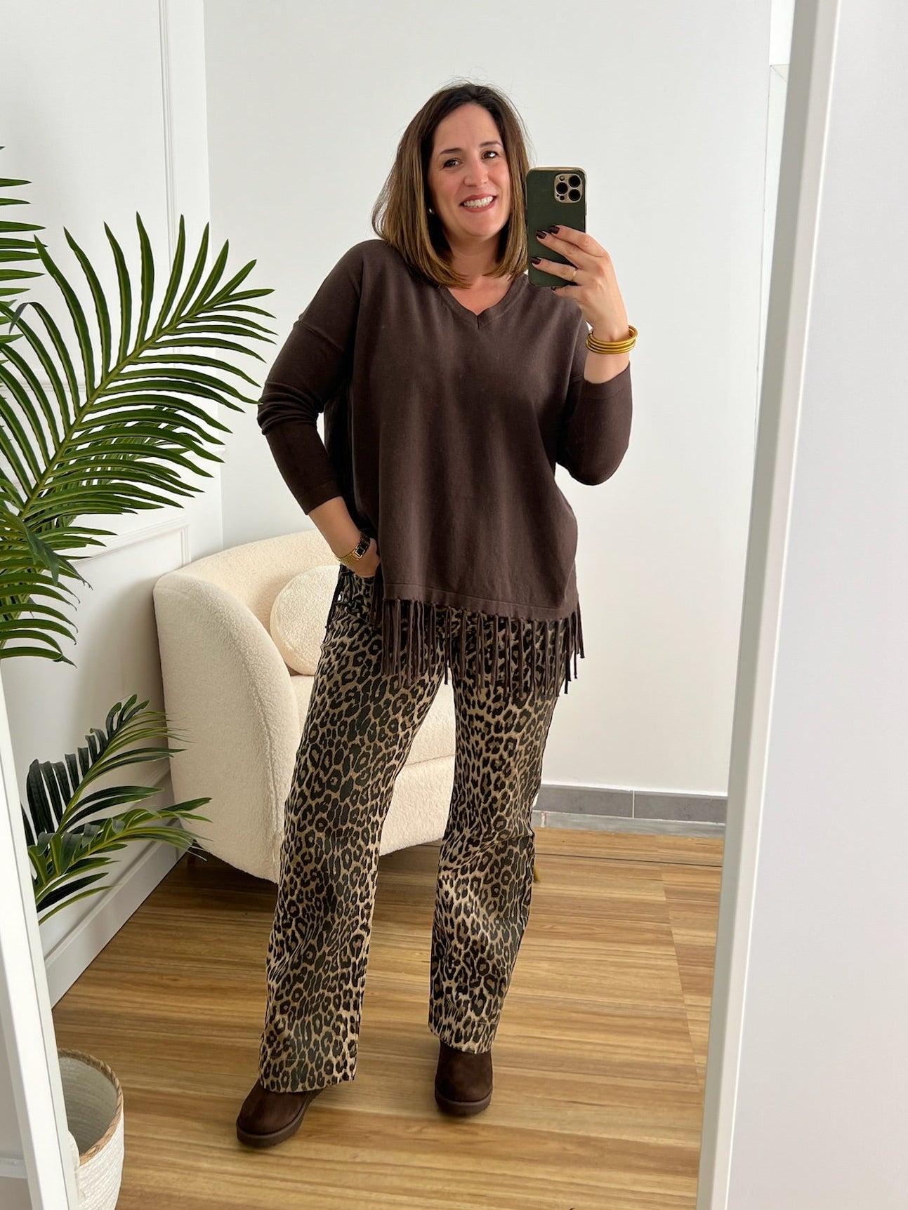 Este jersey marrón con flecos es la prenda ideal para darle un aire fresco y desenfadado a tus looks de otoño. Su diseño con escote en V aporta un toque femenino, mientras que el detalle de flecos en el bajo lo convierte en un jersey diferente y con personalidad.