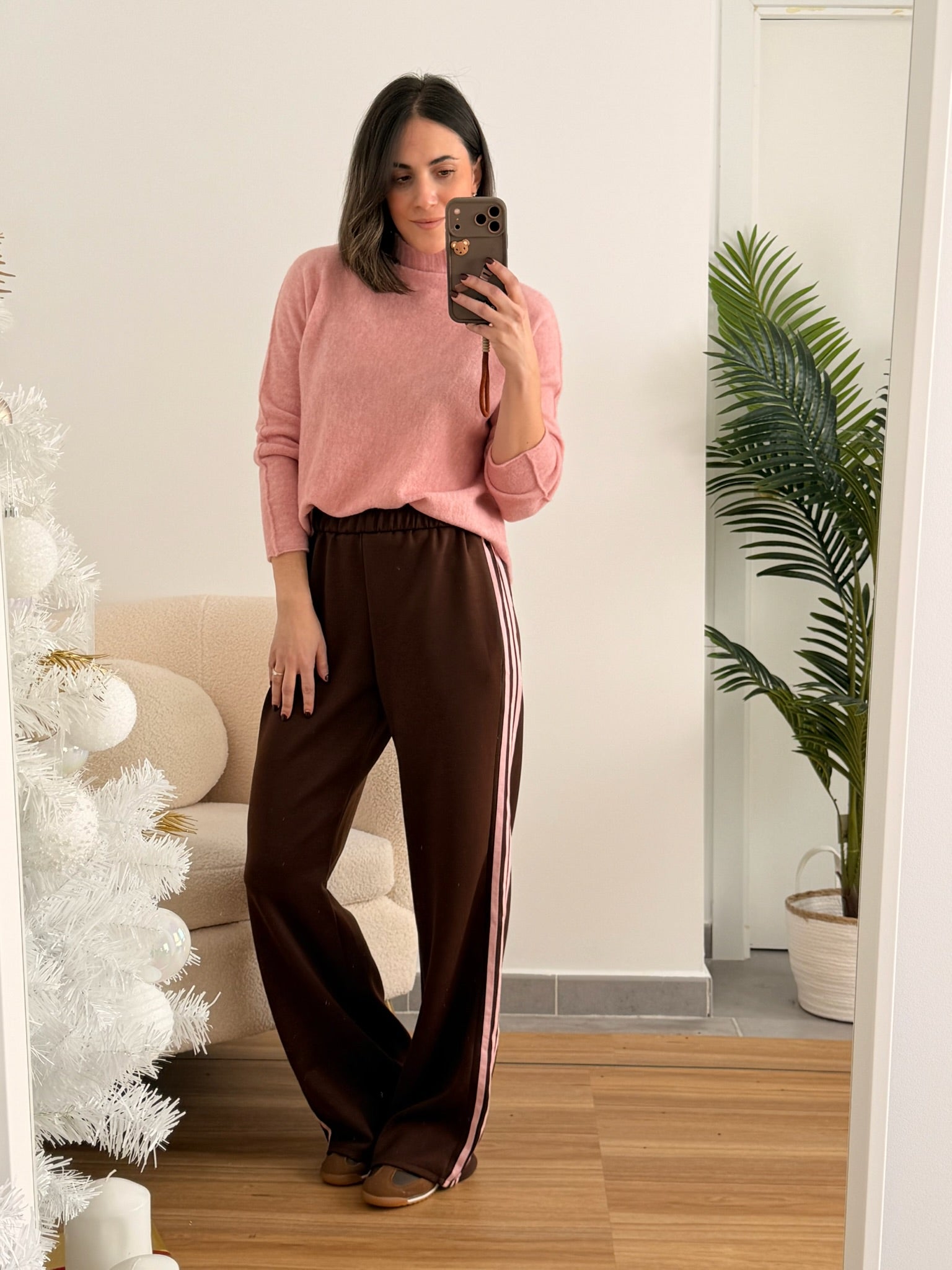Comodidad y estilo en una misma prenda. Nuestro pantalón jogger marrón con detalle de tres rayas en rosa es perfecto para conseguir un look casual y tendencia sin renunciar al confort. Su tejido suave y su cinturilla elástica hacen que se adapte de maravilla, mientras que su corte recto ligeramente ancho estiliza y alarga la figura.