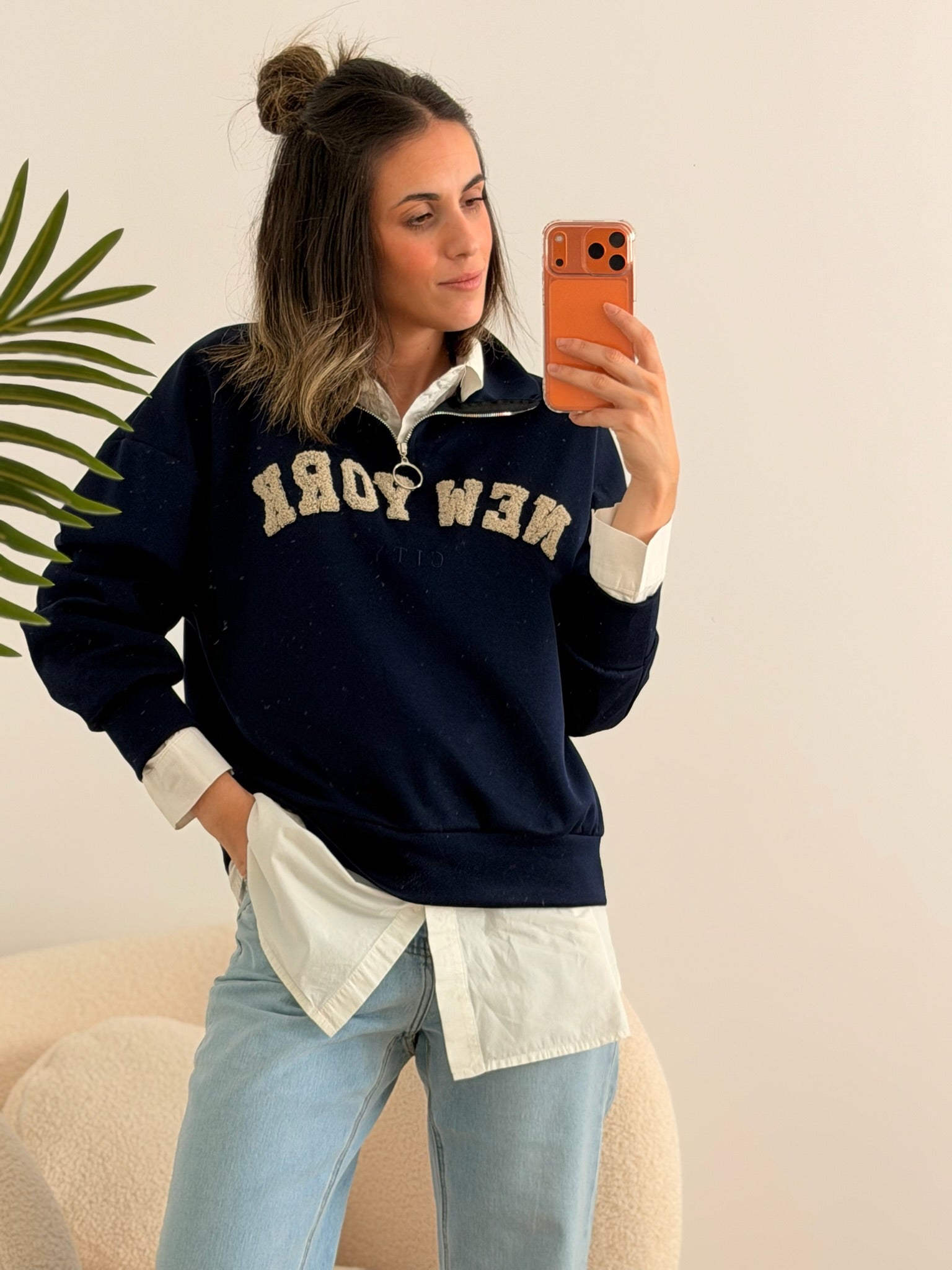 La sudadera New York es la prenda ideal para un look casual con un toque urbano. Confeccionada en tejido suave y cálido, destaca por su diseño con cremallera y detalle de aro metálico en el cuello. El bordado en relieve tipo borreguito en color crudo aporta un contraste perfecto sobre el fondo burdeos.
