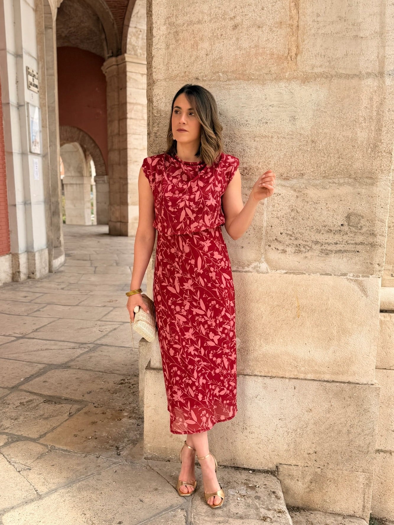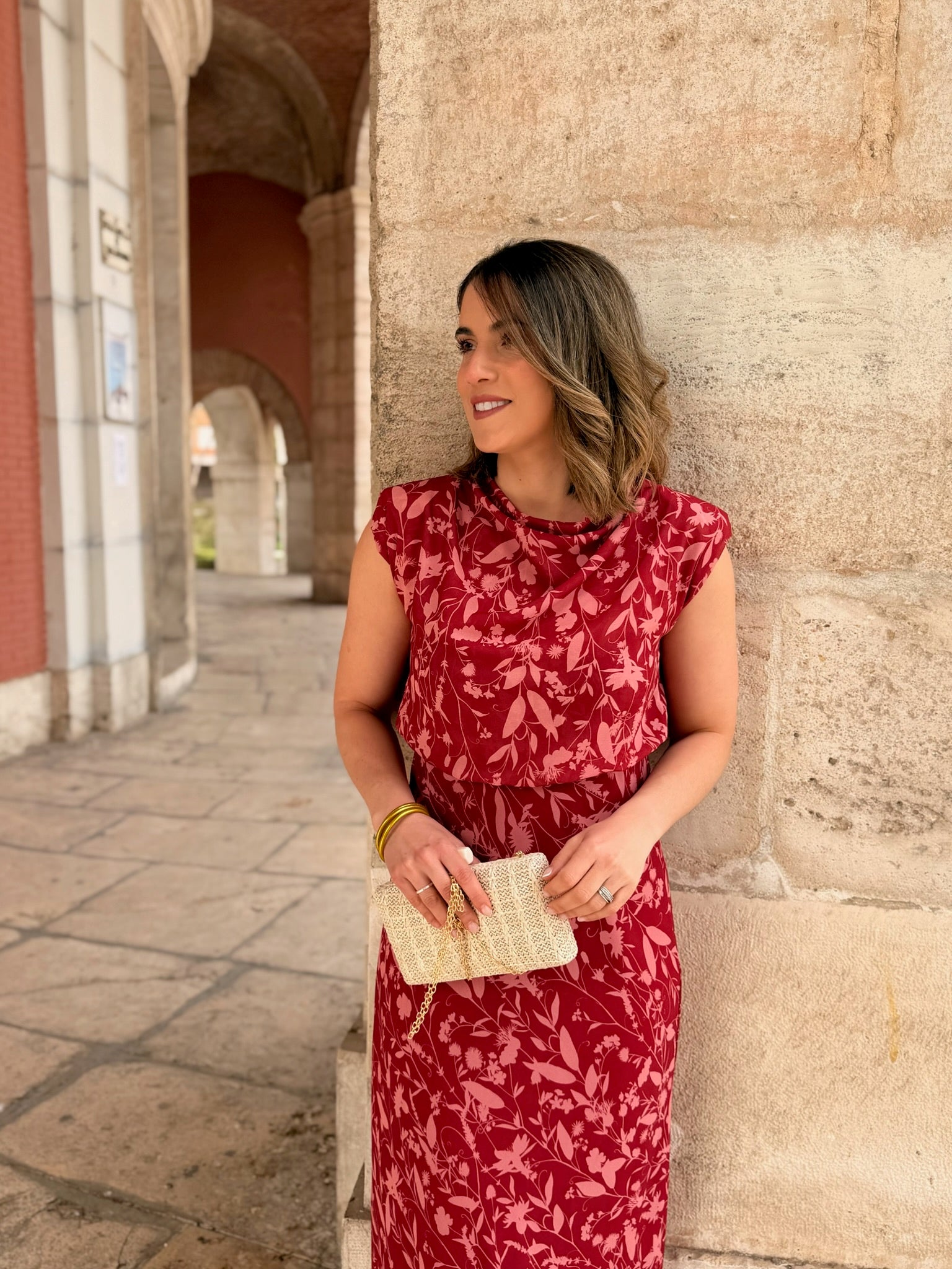 El vestido Daria es una apuesta segura para tus eventos más especiales. Su estampado floral en tono rojo aporta un aire elegante y femenino, mientras que su corte fluido con cintura engomada marcada estiliza la silueta de forma natural, ayudando la goma de la cintura a adaptarse perfectamente al cuerpo.