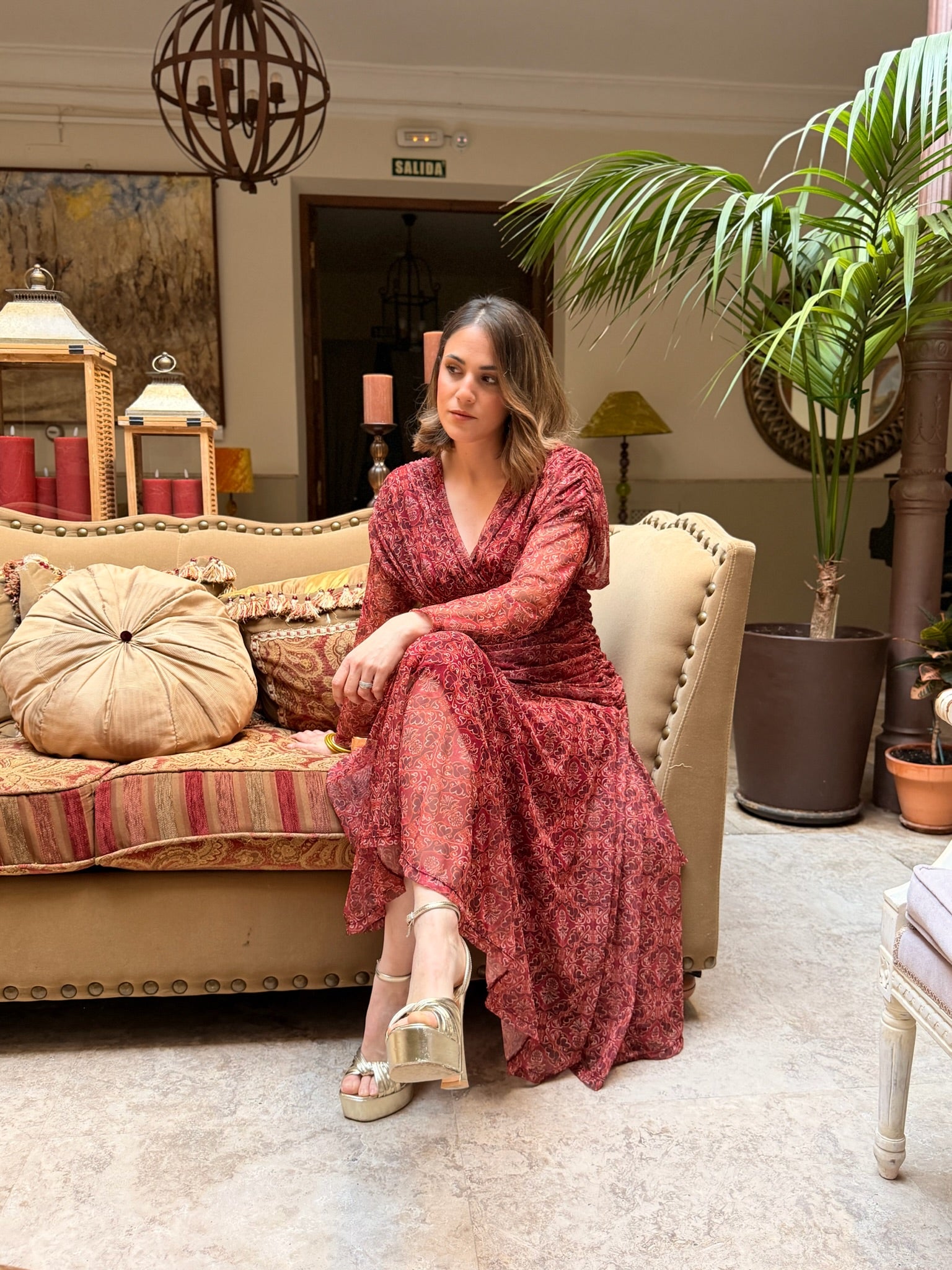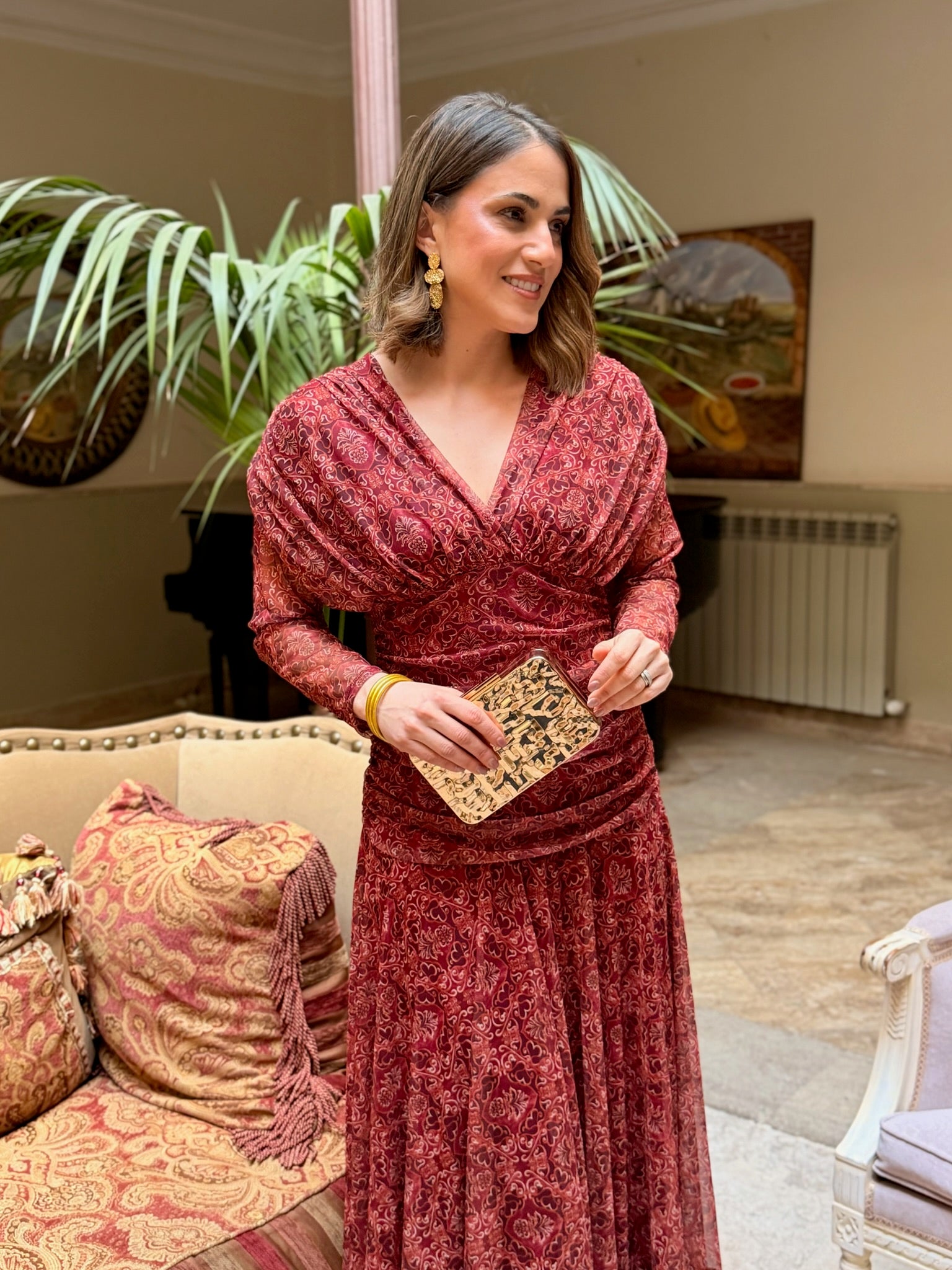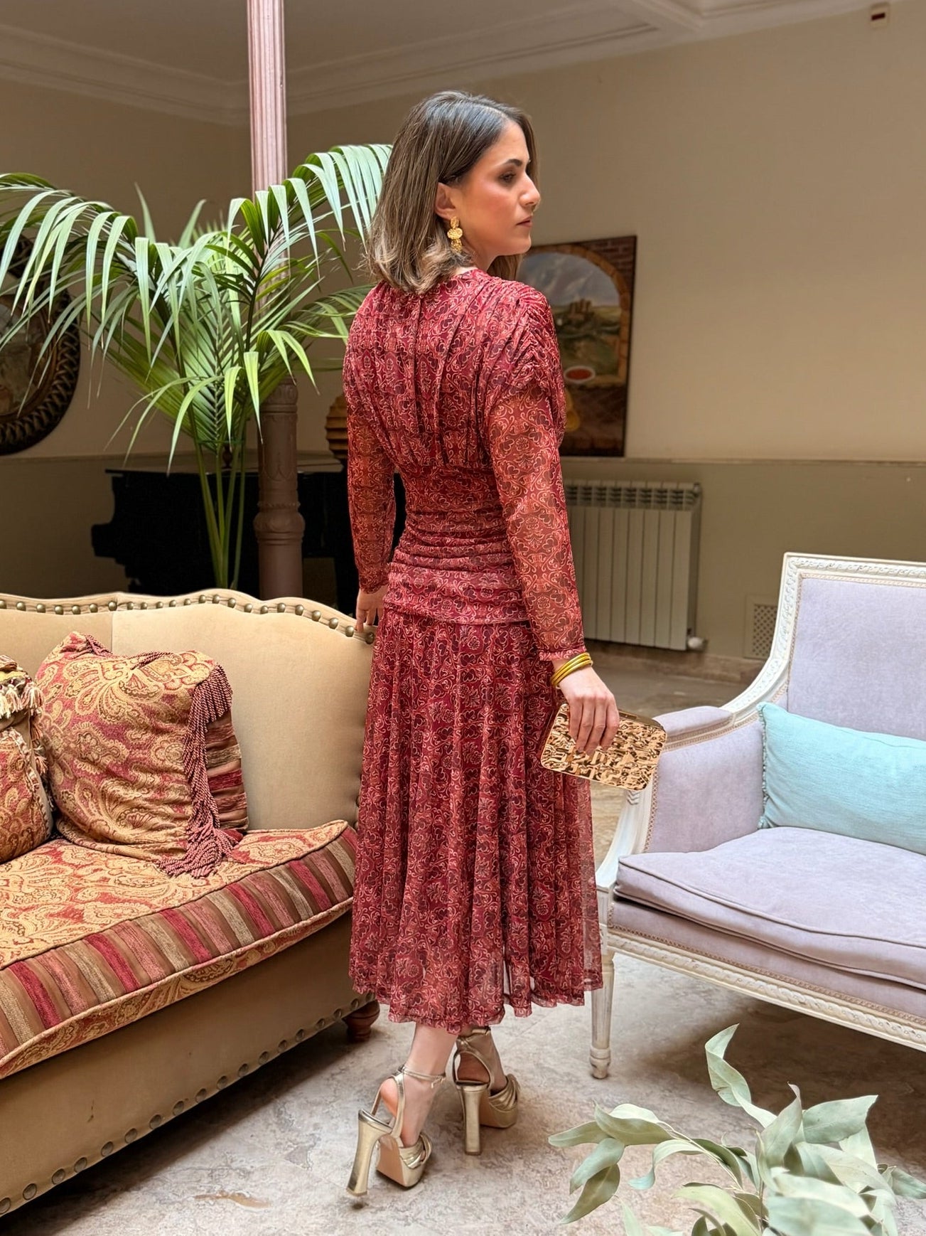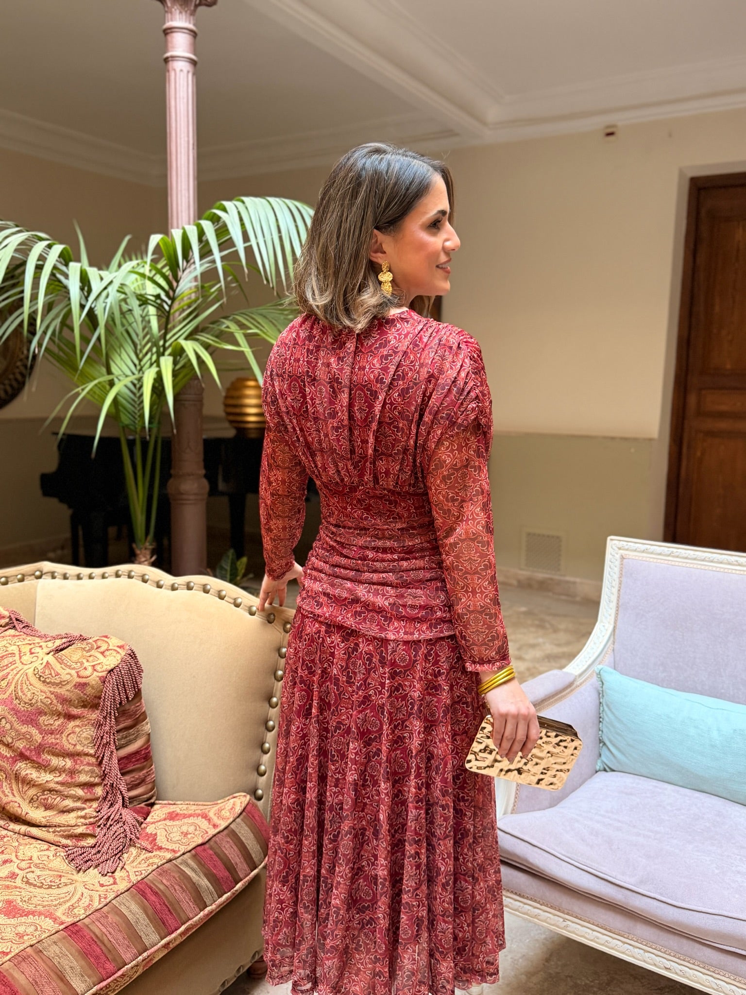 Elegancia y movimiento se unen en este diseño con escote cruzado en pico, cuerpo drapeado que estiliza la figura 💫 y mangas largas de tul semitransparente con delicado estampado 🌿.
