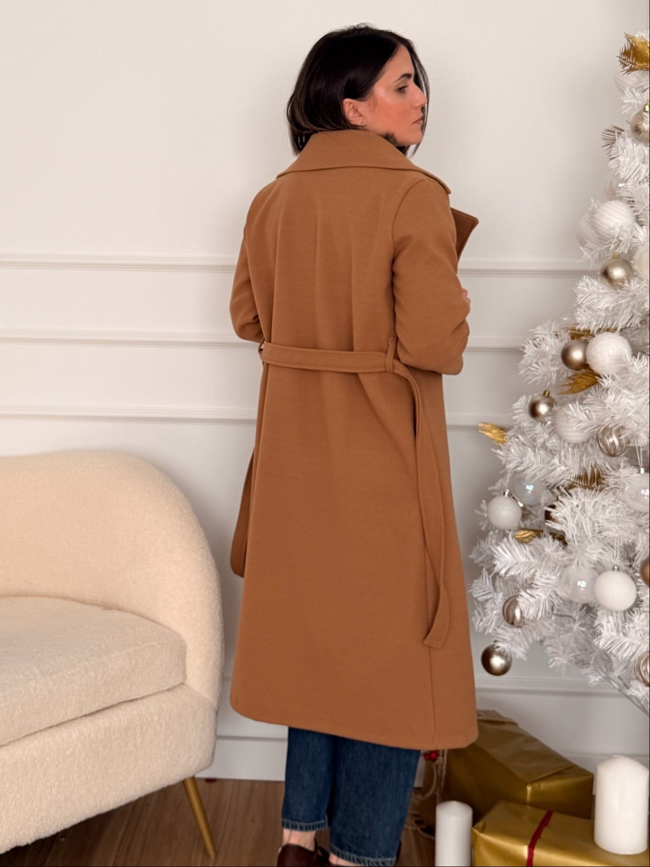 Abrigo largo clásico de corte recto, una prenda atemporal que eleva cualquier look del día a día. Confeccionado en tejido suave y agradable, destaca por su diseño cruzado con doble botonadura, solapas amplias y un largo ideal para estilizar la silueta.