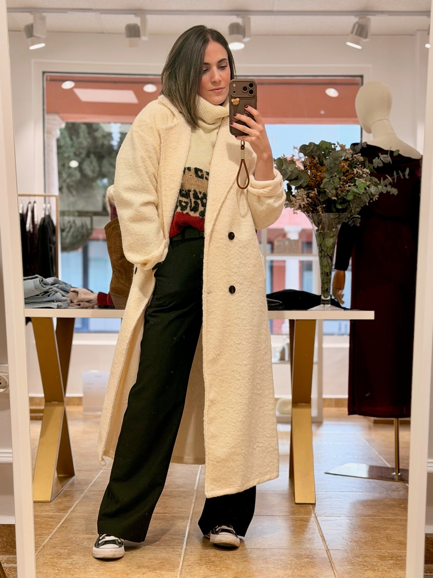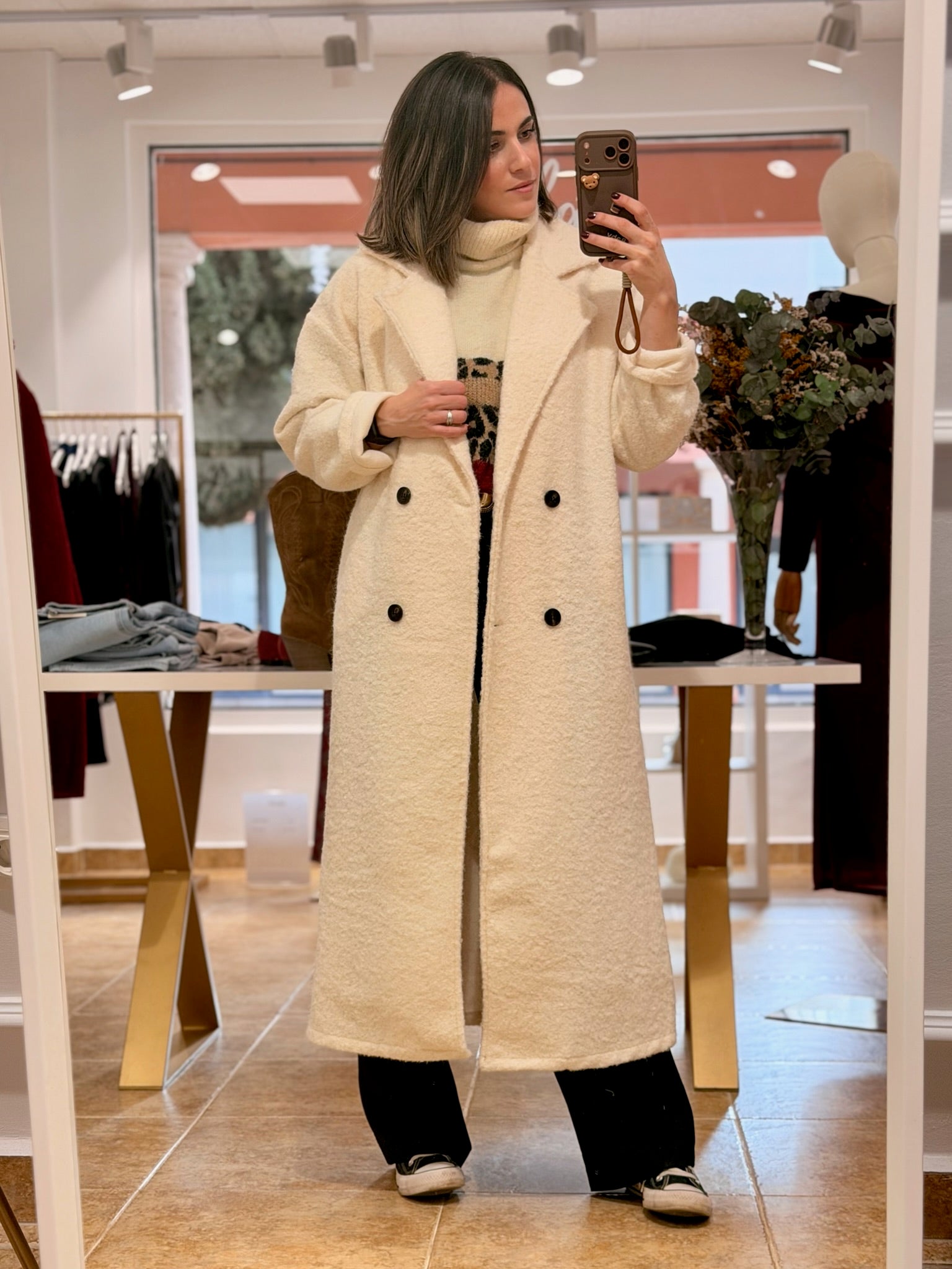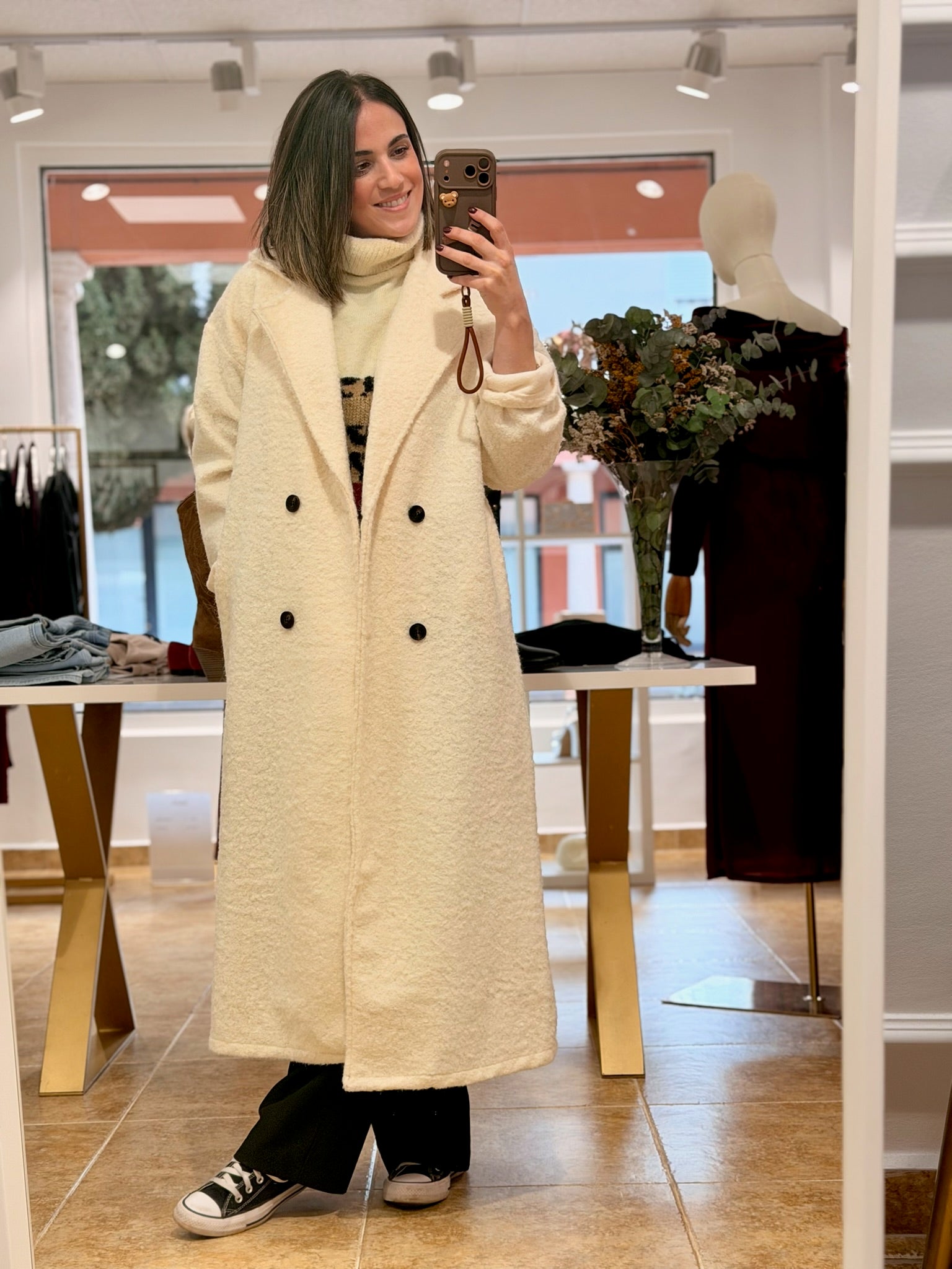 Este elegante abrigo Zulema largo ofrece una textura suave y cómoda. Su diseño de doble botonadura y su tonalidad blanca crean un look sofisticado y versátil, perfecto para cualquier ocasión. Ideal para mantenerte abrigada sin sacrificar el estilo, es una prenda que puede complementar tanto tu look casual como uno más formal