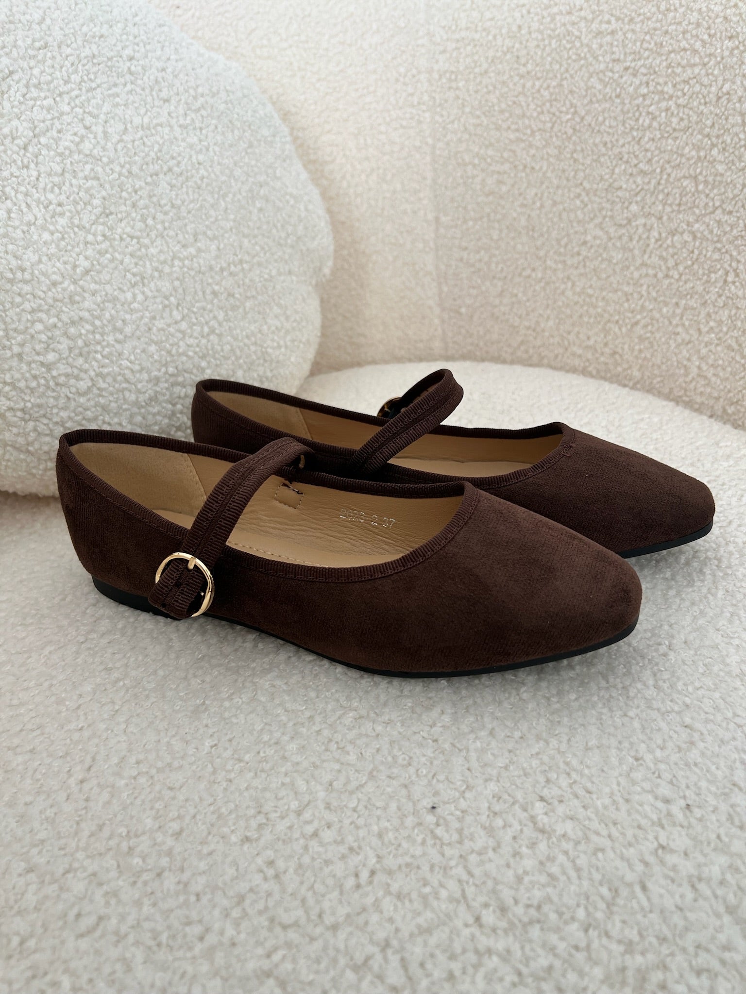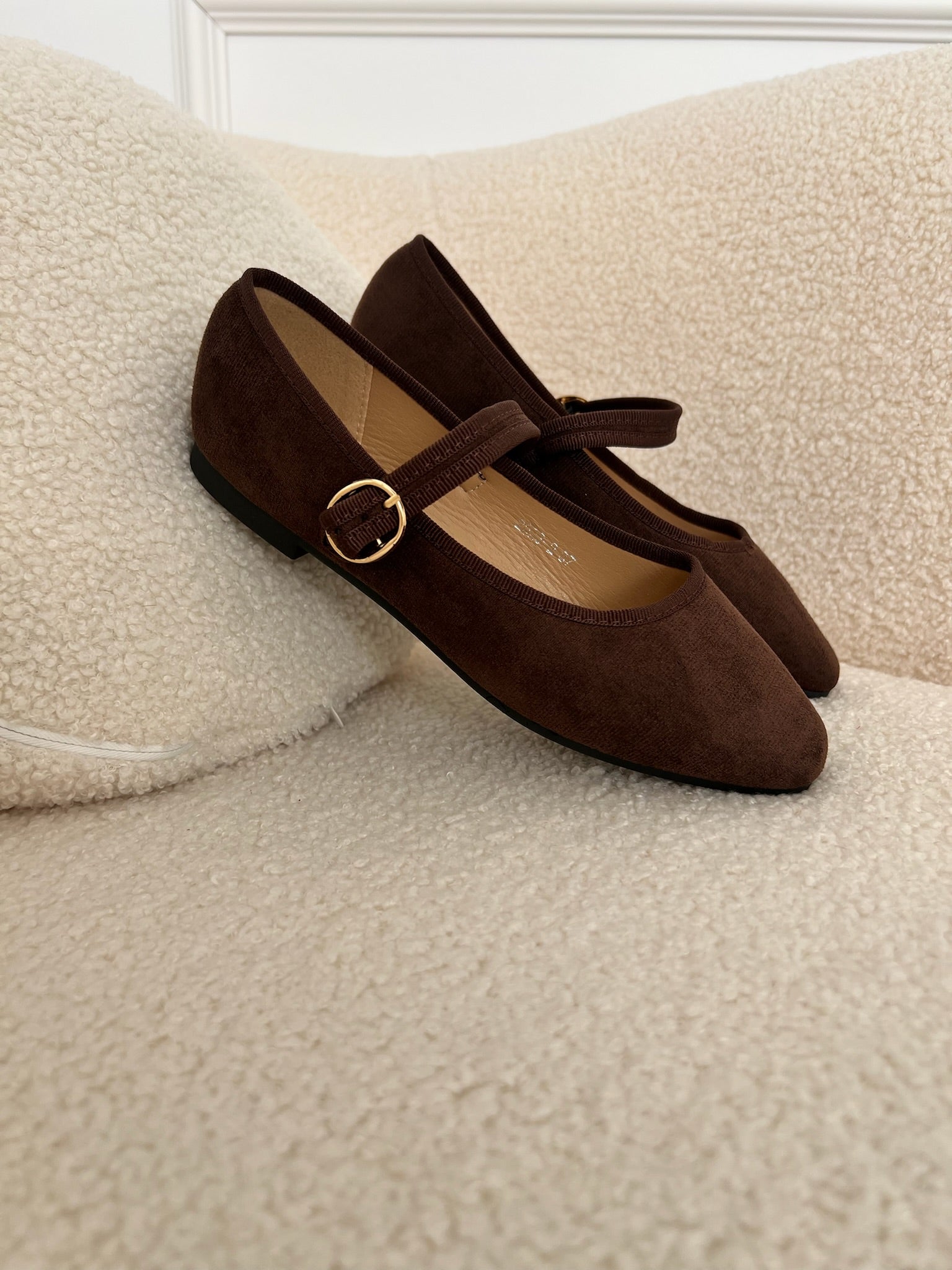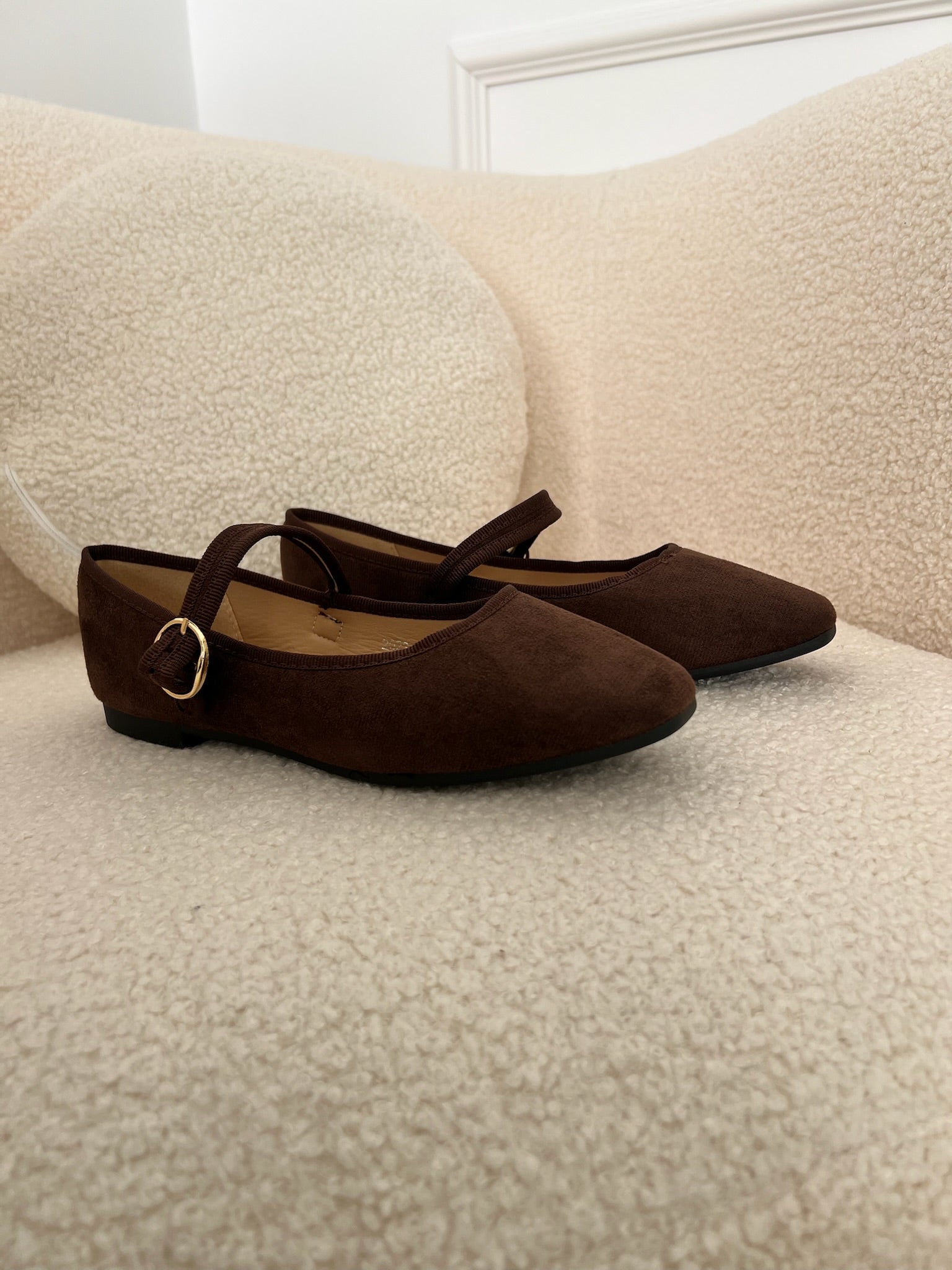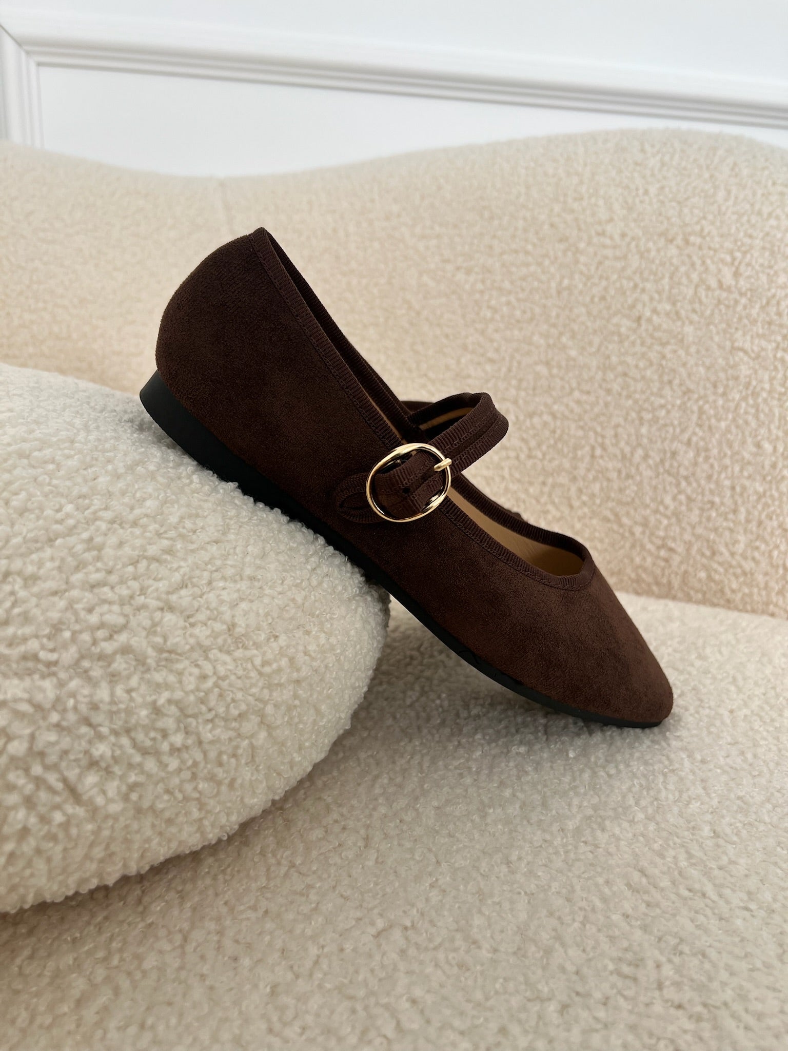 Estas bailarinas chocolate son el equilibrio perfecto entre estilo y comodidad. Confeccionadas en un suave tejido tipo ante, destacan por su diseño clásico tipo merceditas con correa ajustable y hebilla dorada, que aporta un toque elegante y femenino.