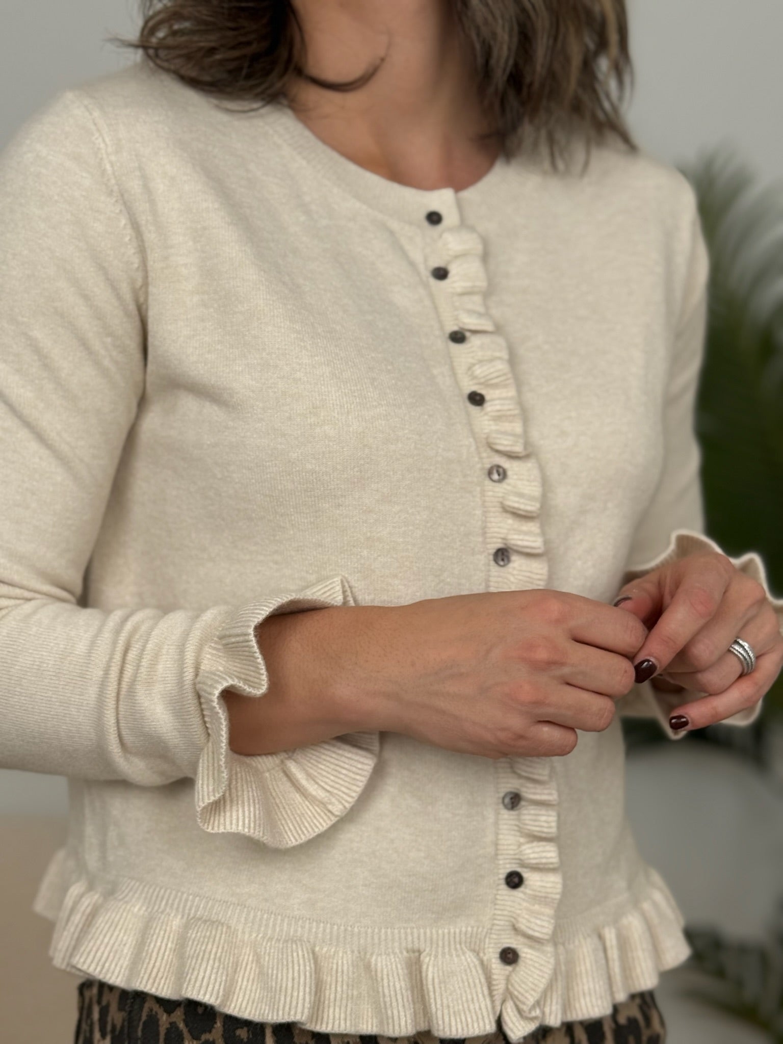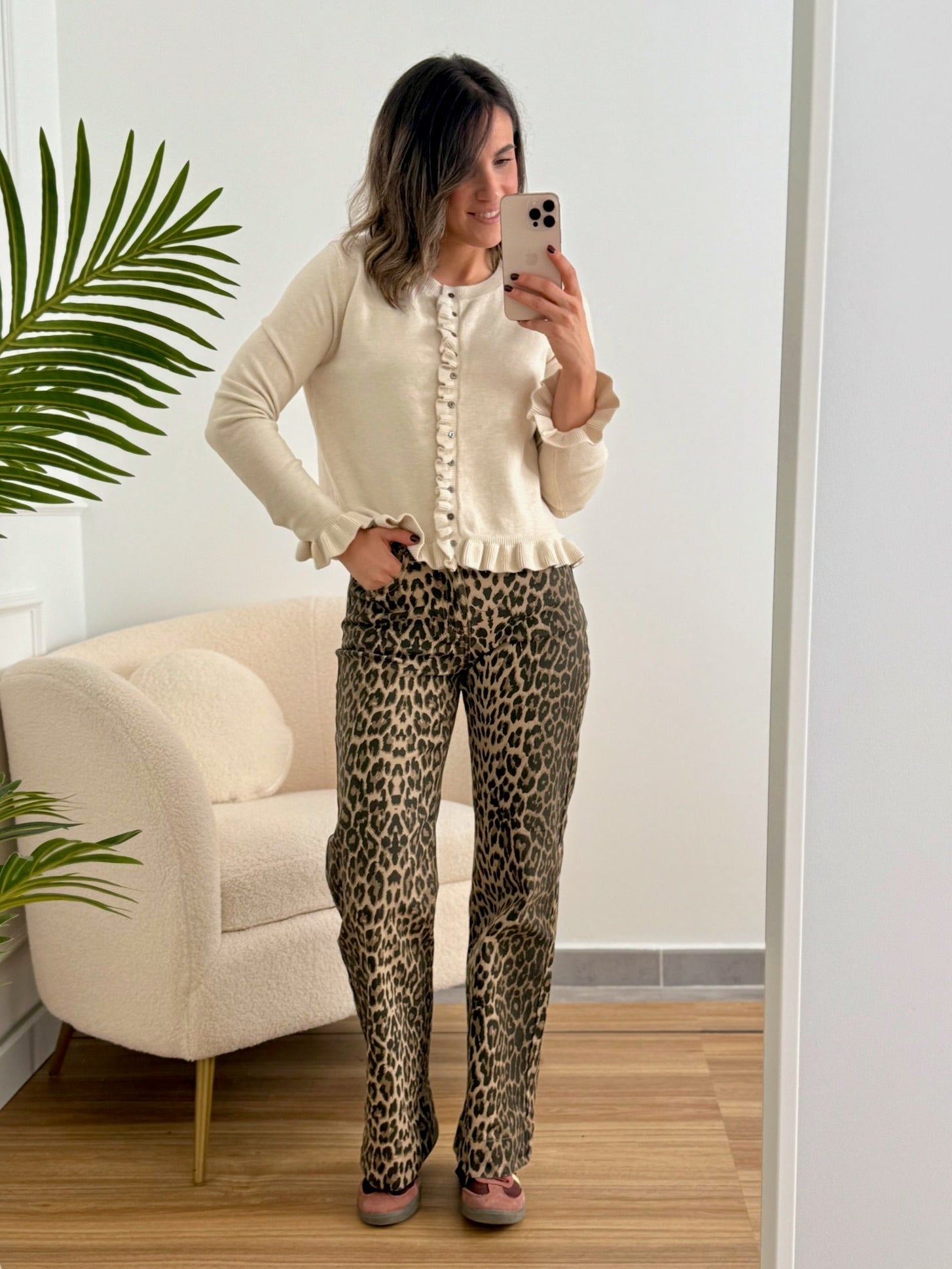 La chaqueta beige de punto con volantes es una prenda delicada y versátil que no puede faltar en tu armario. Su diseño combina lo clásico y lo femenino gracias al detalle de volantes en el bajo y los puños, aportando un aire romántico y diferente a un básico atemporal.