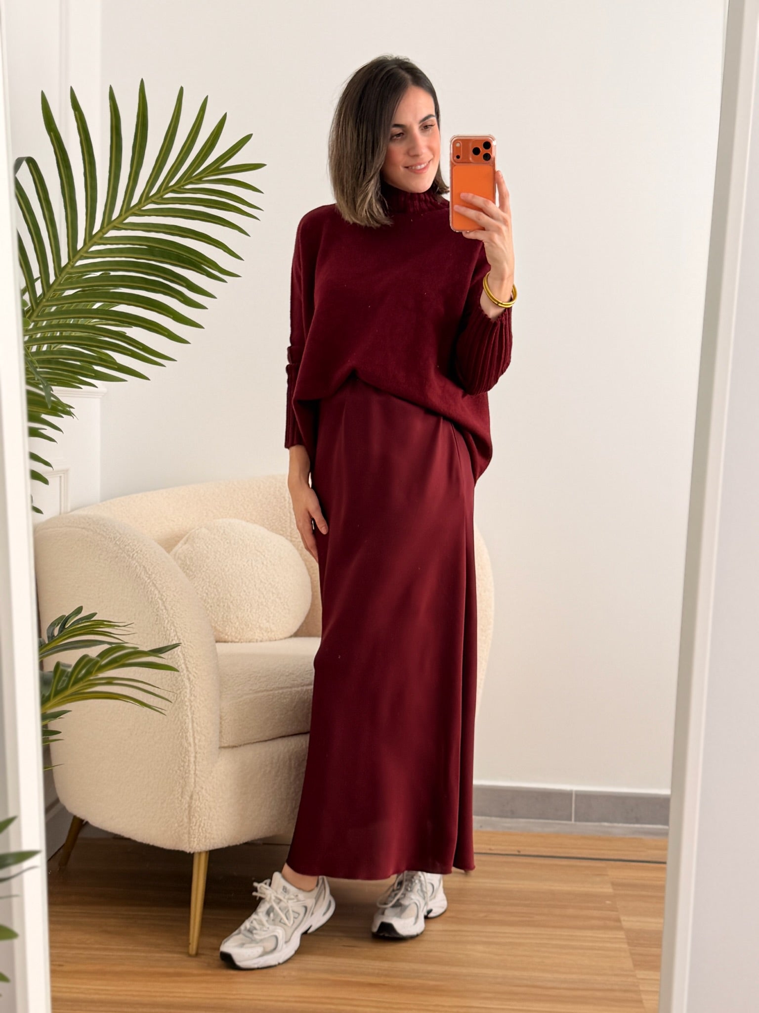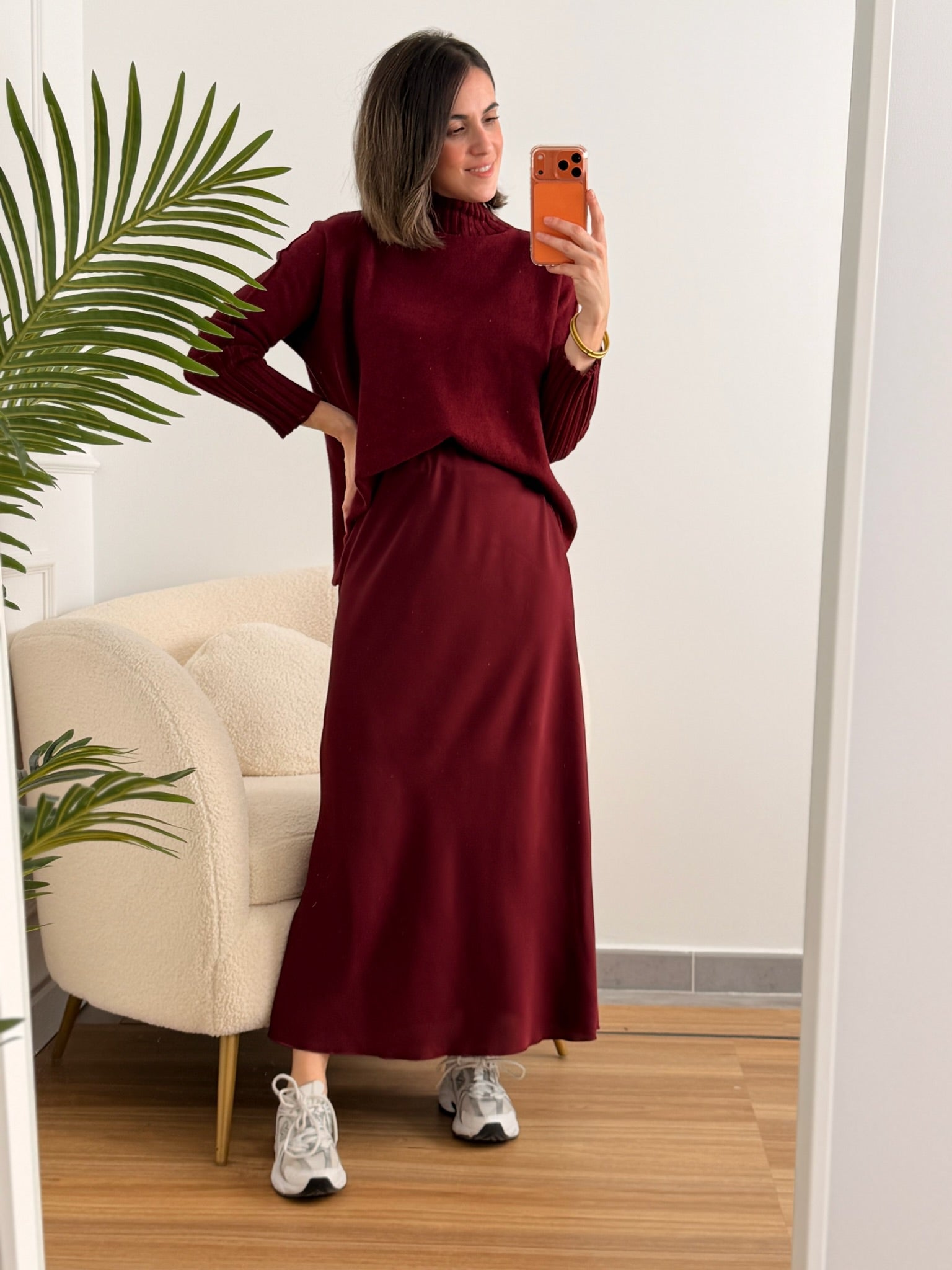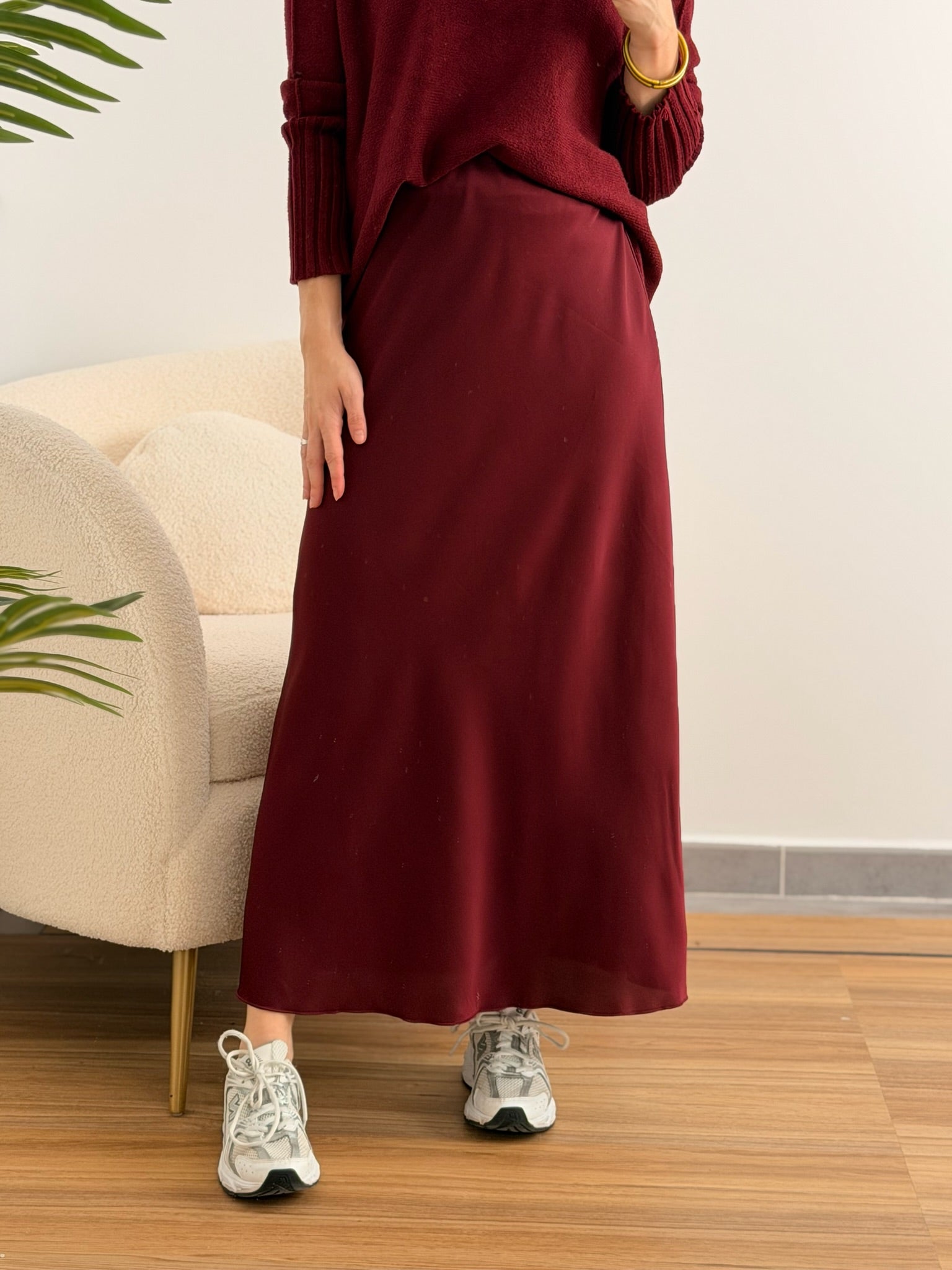 Falda satinada burdeos de corte midi, con un acabado fluido y elegante que aporta movimiento y brillo a cada paso. Su cintura elástica ofrece un ajuste cómodo y favorecedor. Perfecta para combinar tanto con jerséis de punto y zapatillas para un look casual chic, como con blusas o tops más sofisticados para un toque de invitada moderna.
