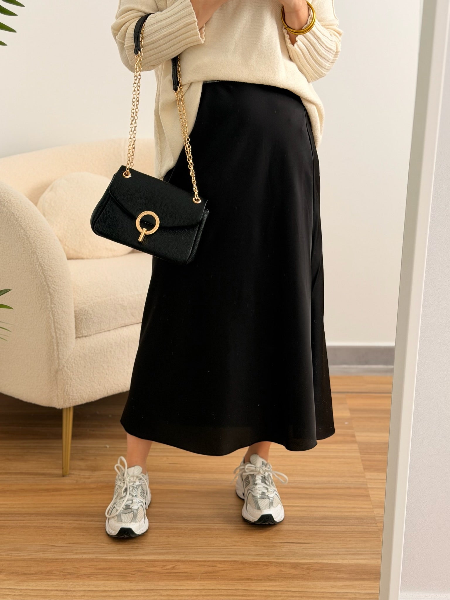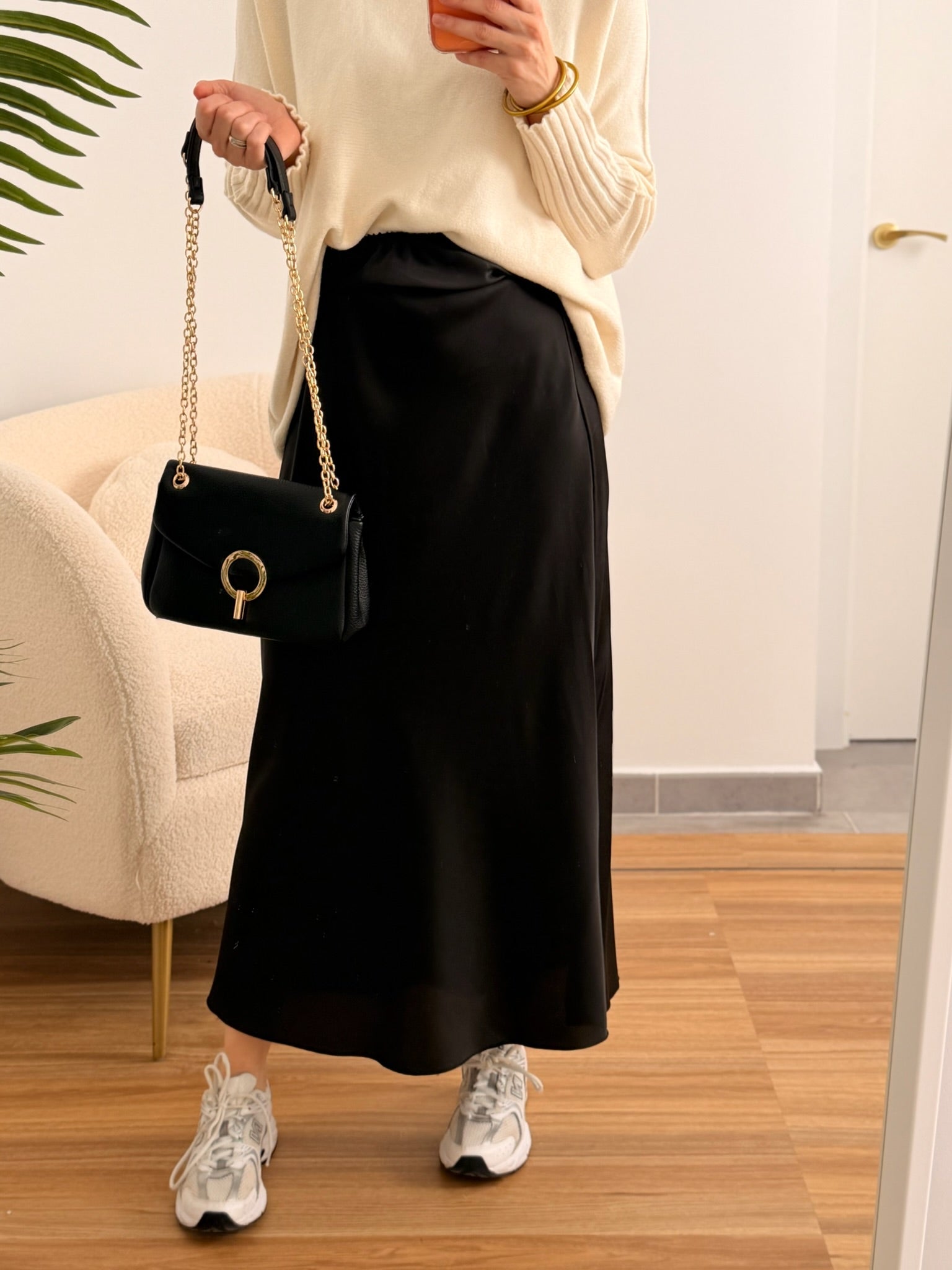 Falda satinada negra de corte midi, con un acabado fluido y elegante que aporta movimiento y brillo a cada paso. Su cintura elástica ofrece un ajuste cómodo y favorecedor. Perfecta para combinar tanto con jerséis de punto y zapatillas para un look casual chic, como con blusas o tops más sofisticados para un toque de invitada moderna.