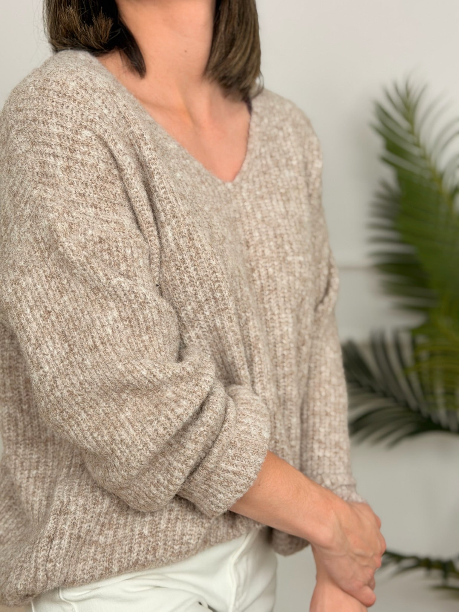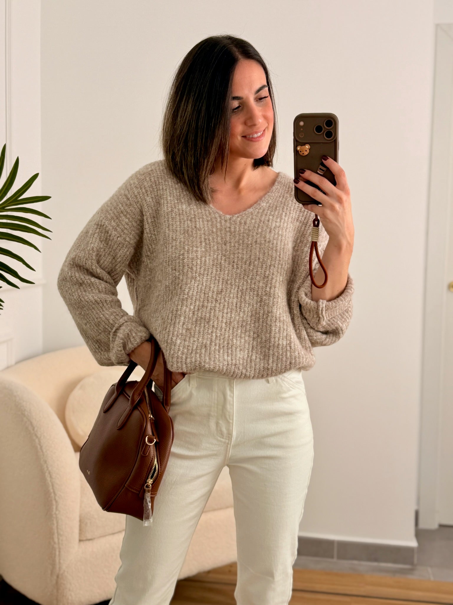 Un básico cálido y estiloso que no puede faltar en tu armario esta temporada. Confeccionado en punto canalé suave, este jersey en tono beige claro tiene un corte relajado, escote en pico y una textura que lo hace tan cómodo como versátil.