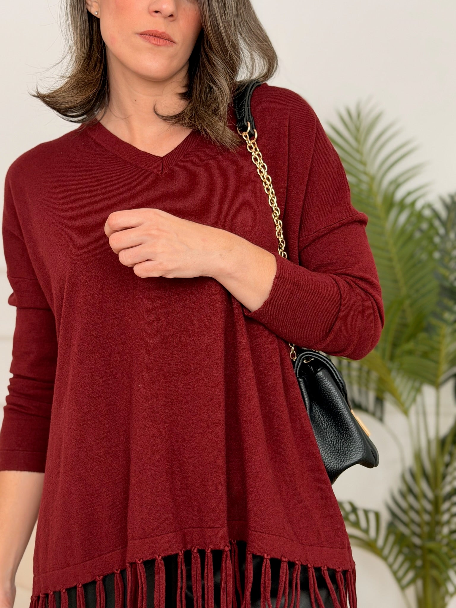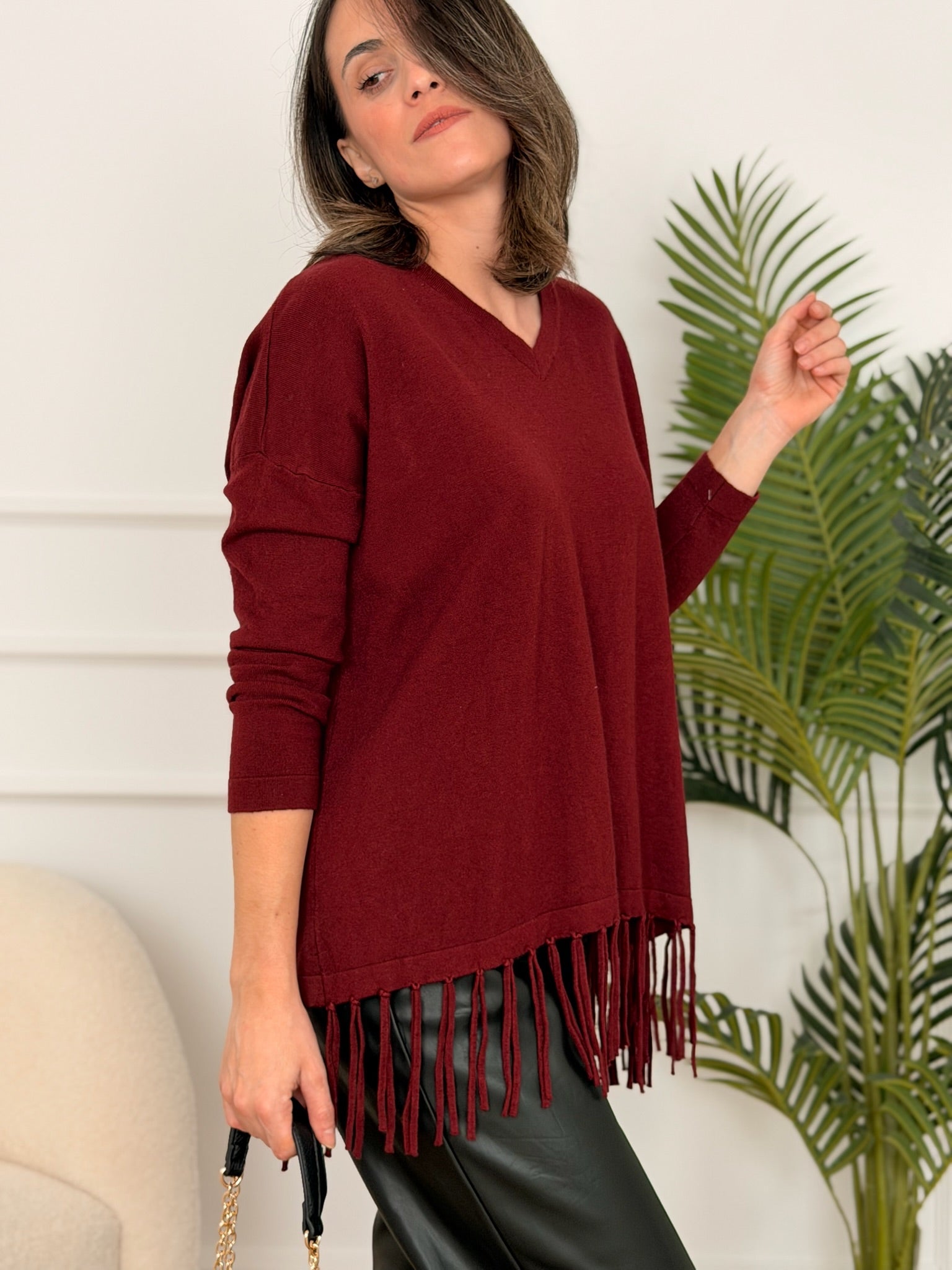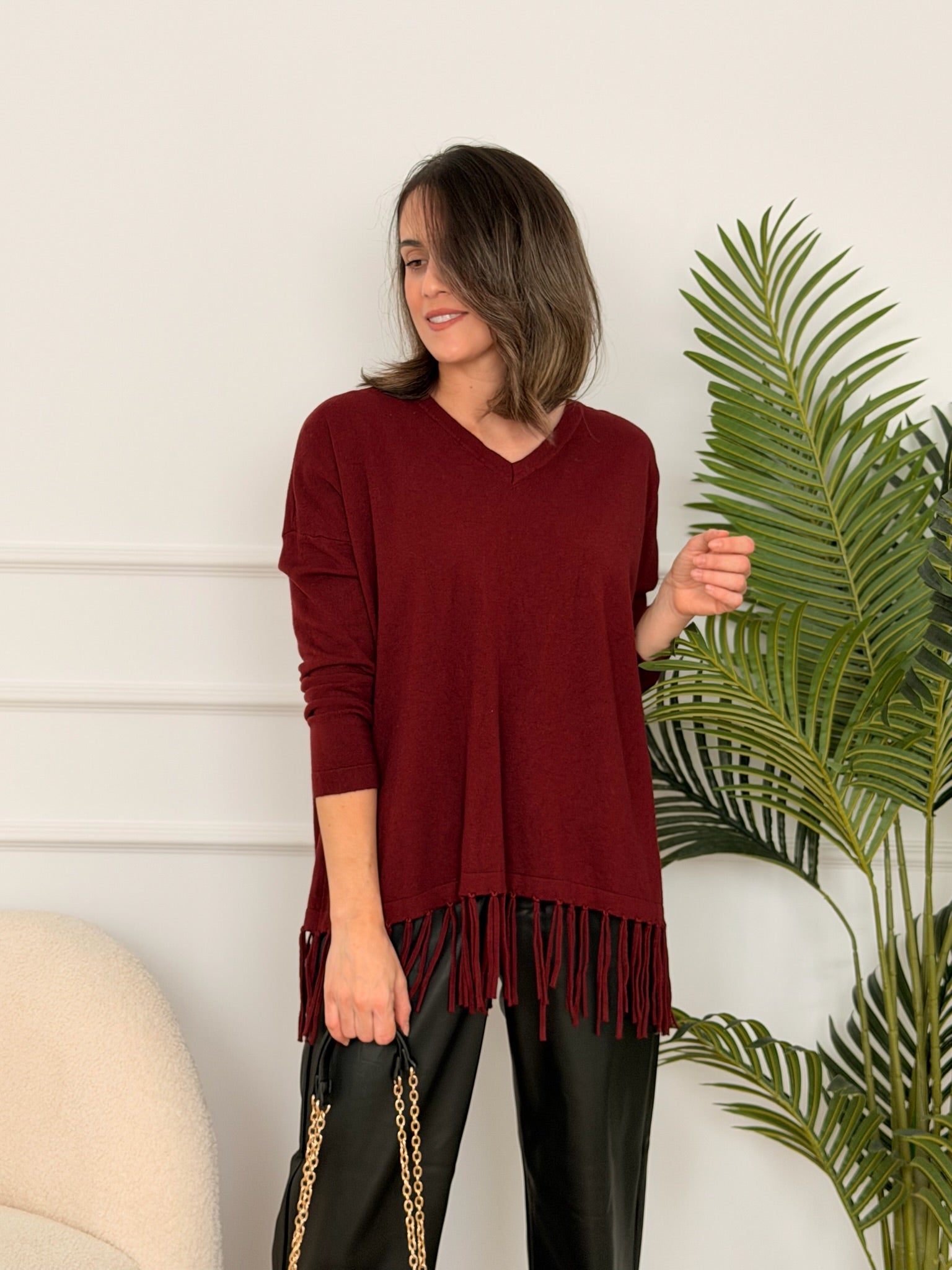 Este jersey burdeos con flecos es la prenda ideal para darle un aire fresco y desenfadado a tus looks de otoño. Su diseño con escote en V aporta un toque femenino, mientras que el detalle de flecos en el bajo lo convierte en un jersey diferente y con personalidad.