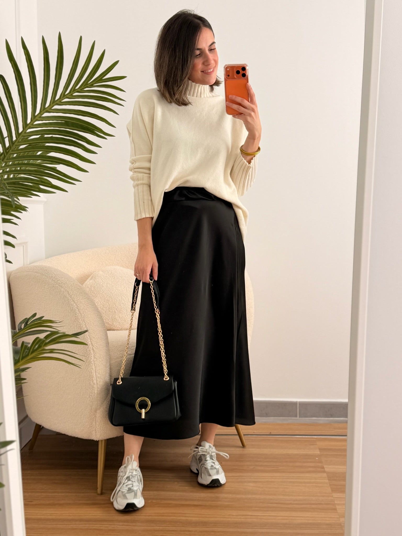 Combínalo con: nuestra falda satinada negra o unos jeans para un look effortless y elegante.
