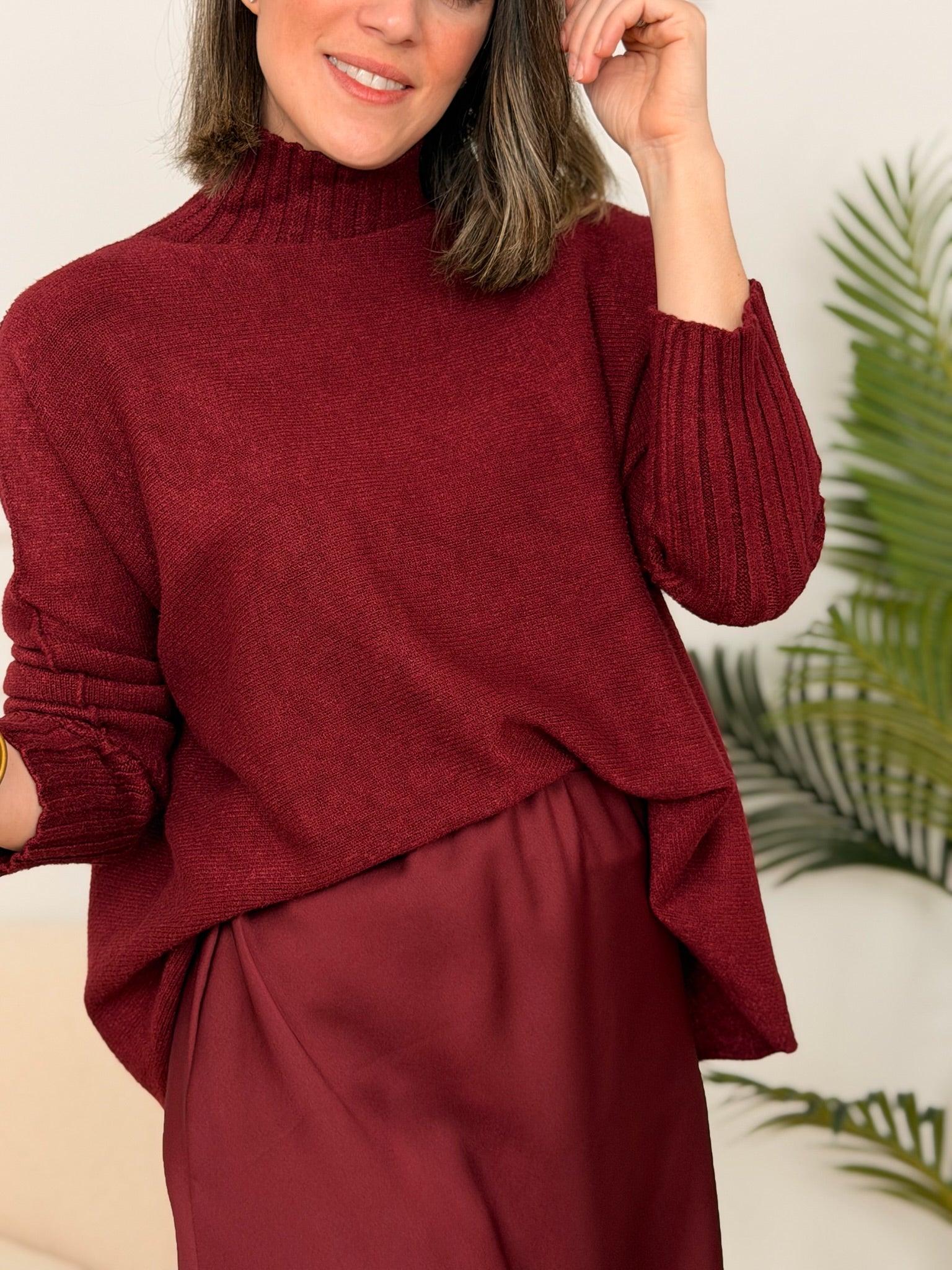 Jersey de punto suave en color burdeos con cuello perkins y diseño de hombro caído. Su tejido agradable y el corte relajado lo convierten en una prenda imprescindible para los días fríos. Combina comodidad y estilo con un acabado ligeramente oversize que sienta bien a todos los tipos de cuerpo. Ideal para llevar con faldas satinadas o pantalones anchos para un look actual y sofisticado.