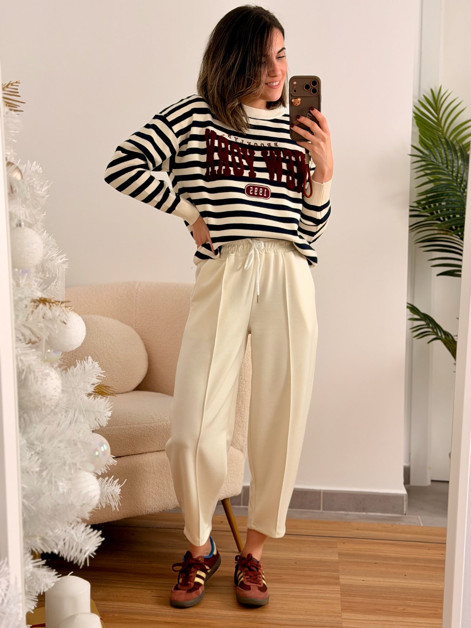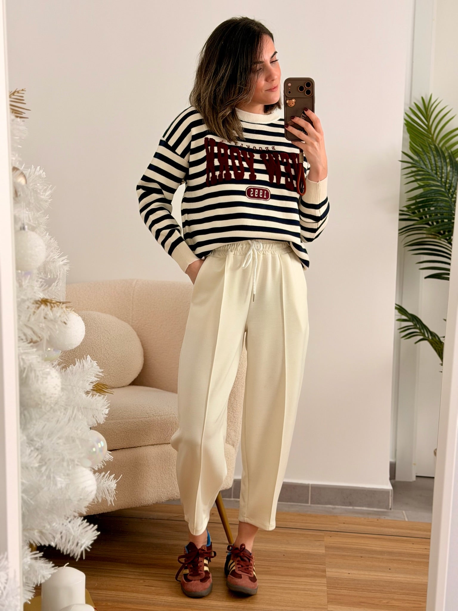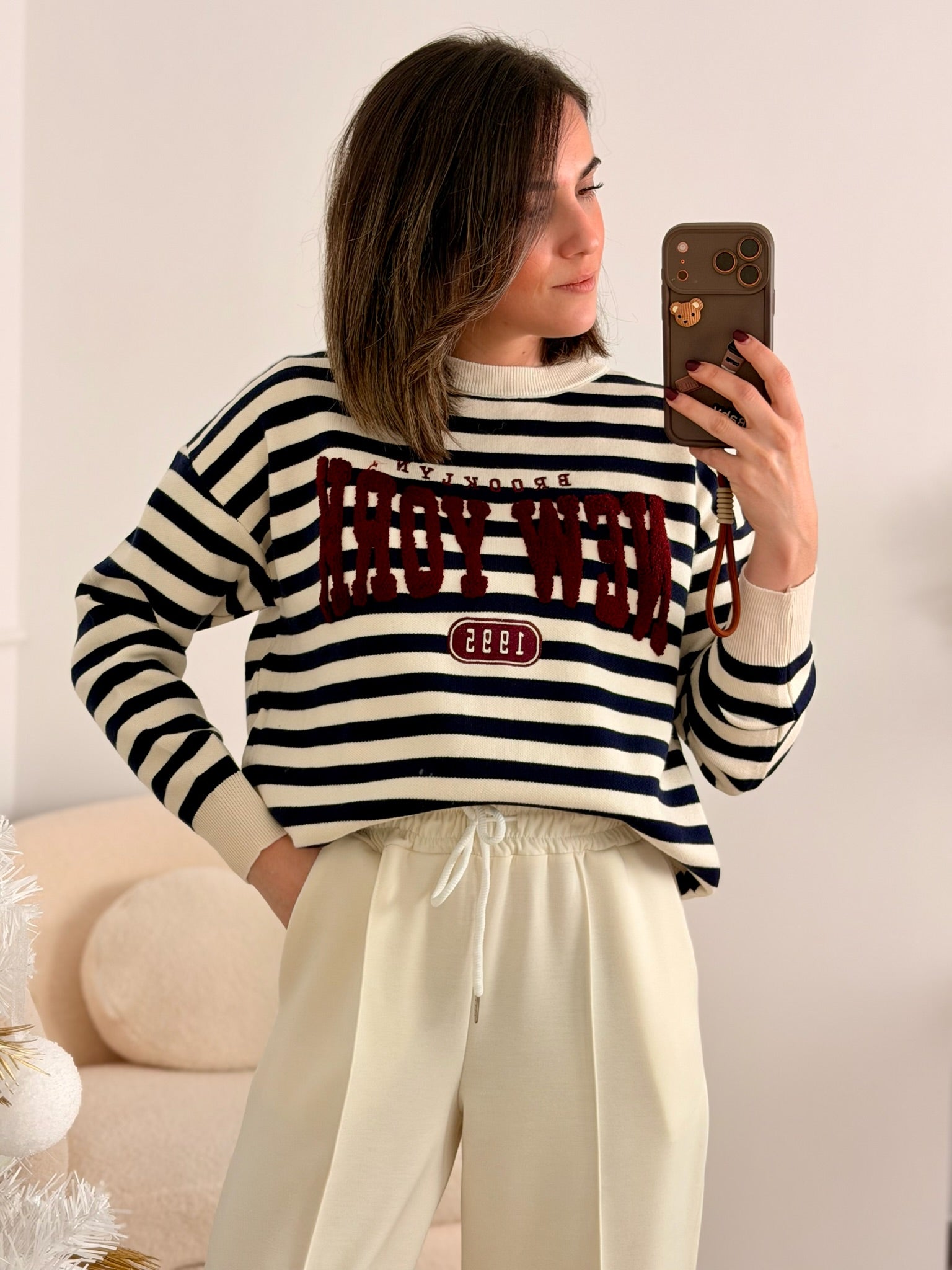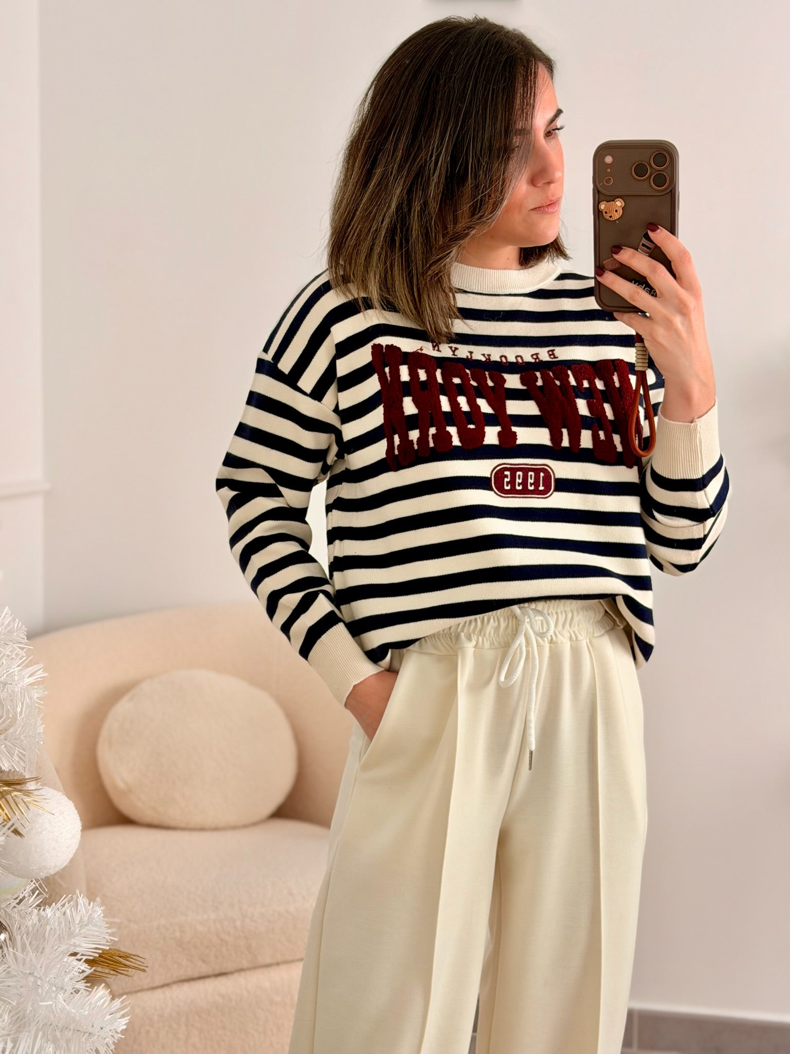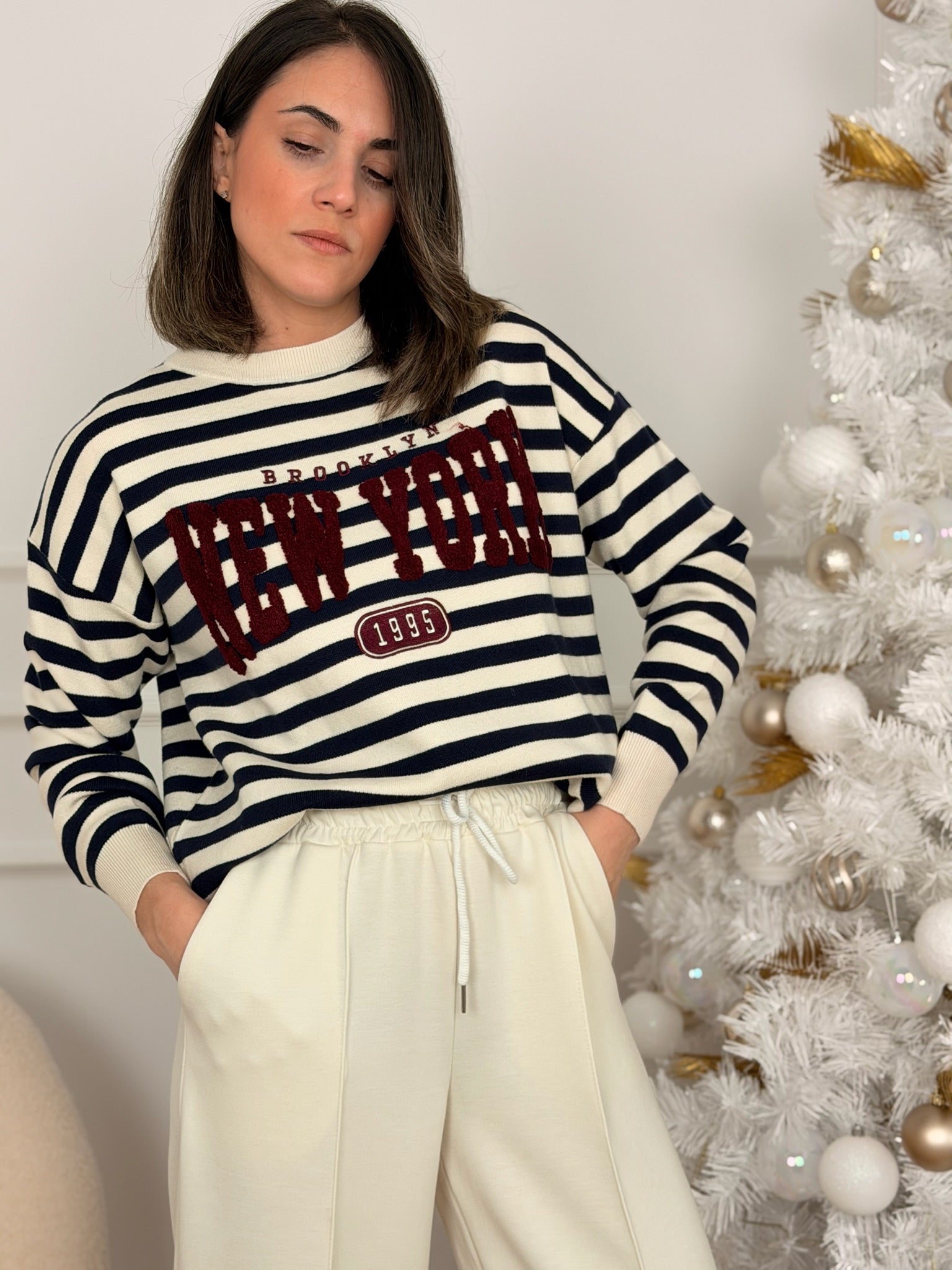 Jersey de estilo casual con rayas marineras en crudo y negro, ideal para darle un toque moderno y desenfadado a tus looks de diario. Destaca por su detalle bordado en relieve New York en tono burdeos, que aporta un punto sporty y tendencia.