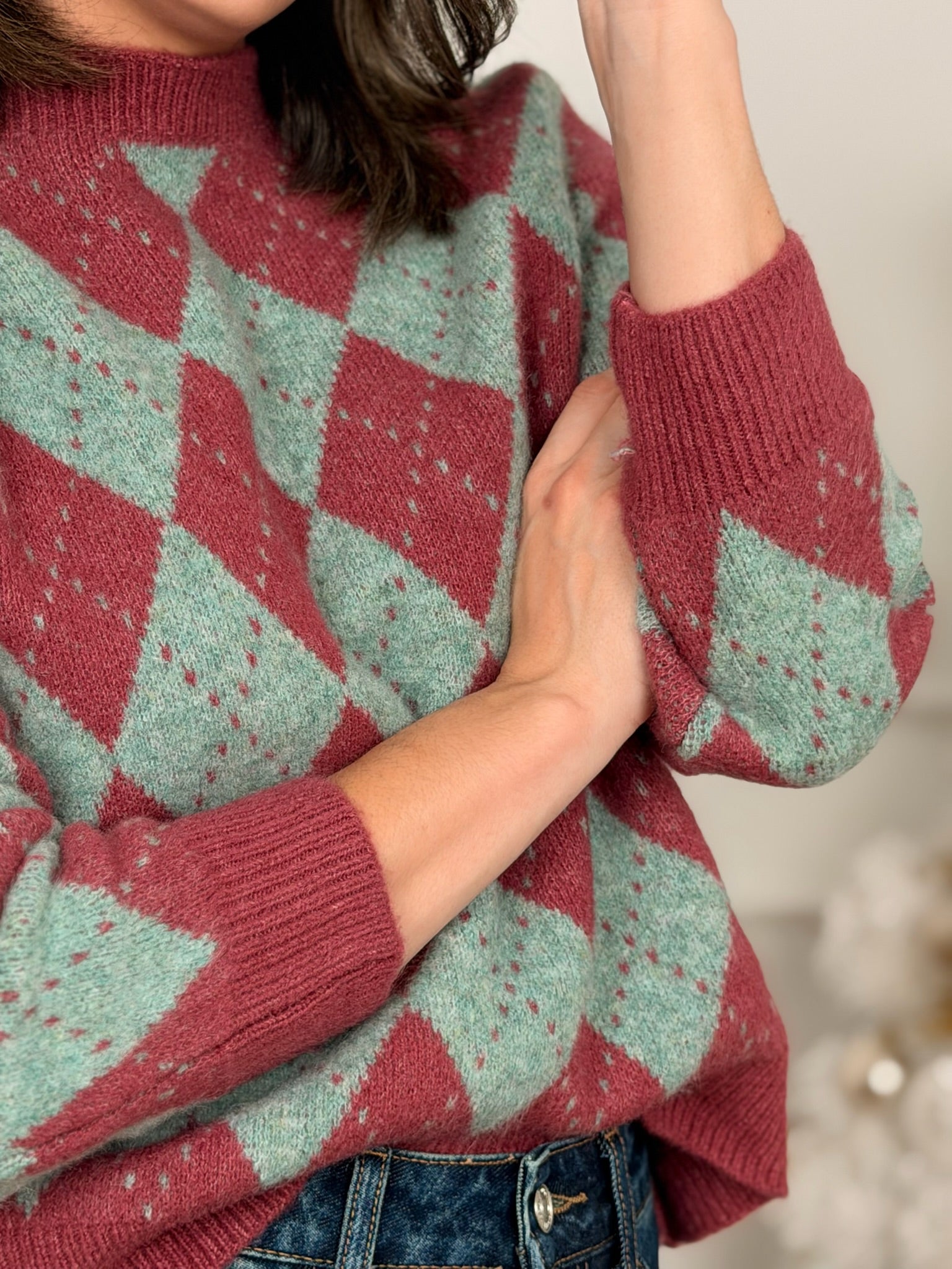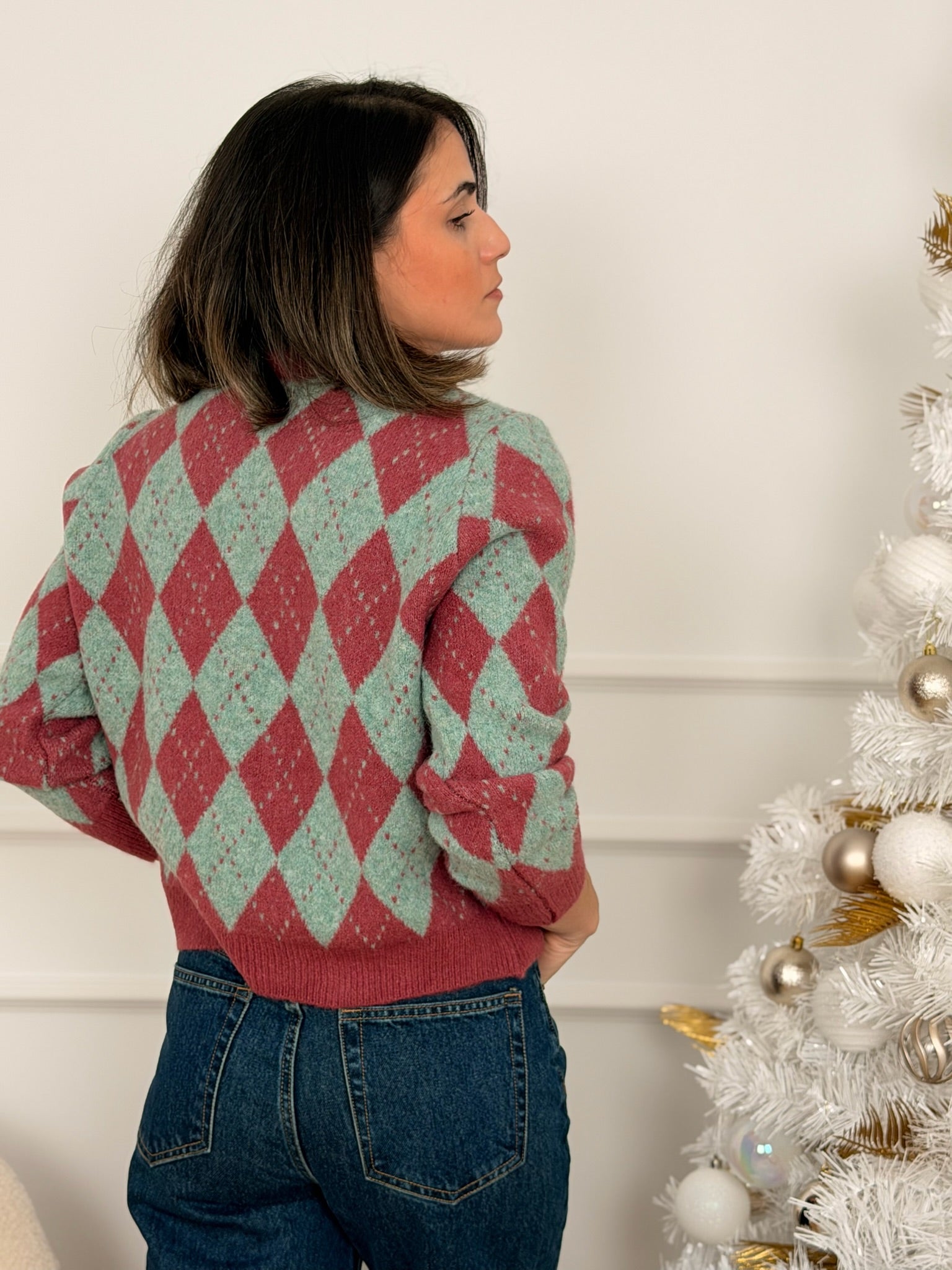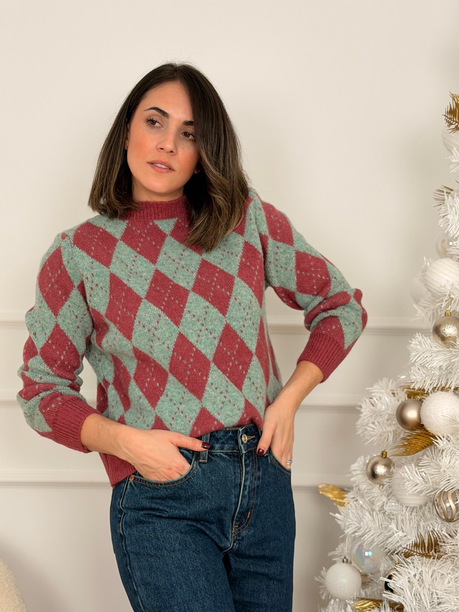 Jersey de punto suave con estampado clásico de rombos estilo argyle en gris y rosa, una combinación vibrante que aporta luz y alegría a cualquier look. Su diseño de corte cómodo y ligeramente relajado lo convierte en una prenda perfecta para el día a día, aportando un toque preppy y actual.