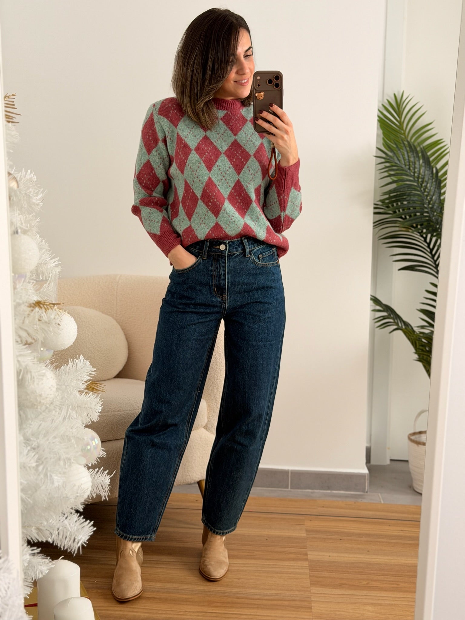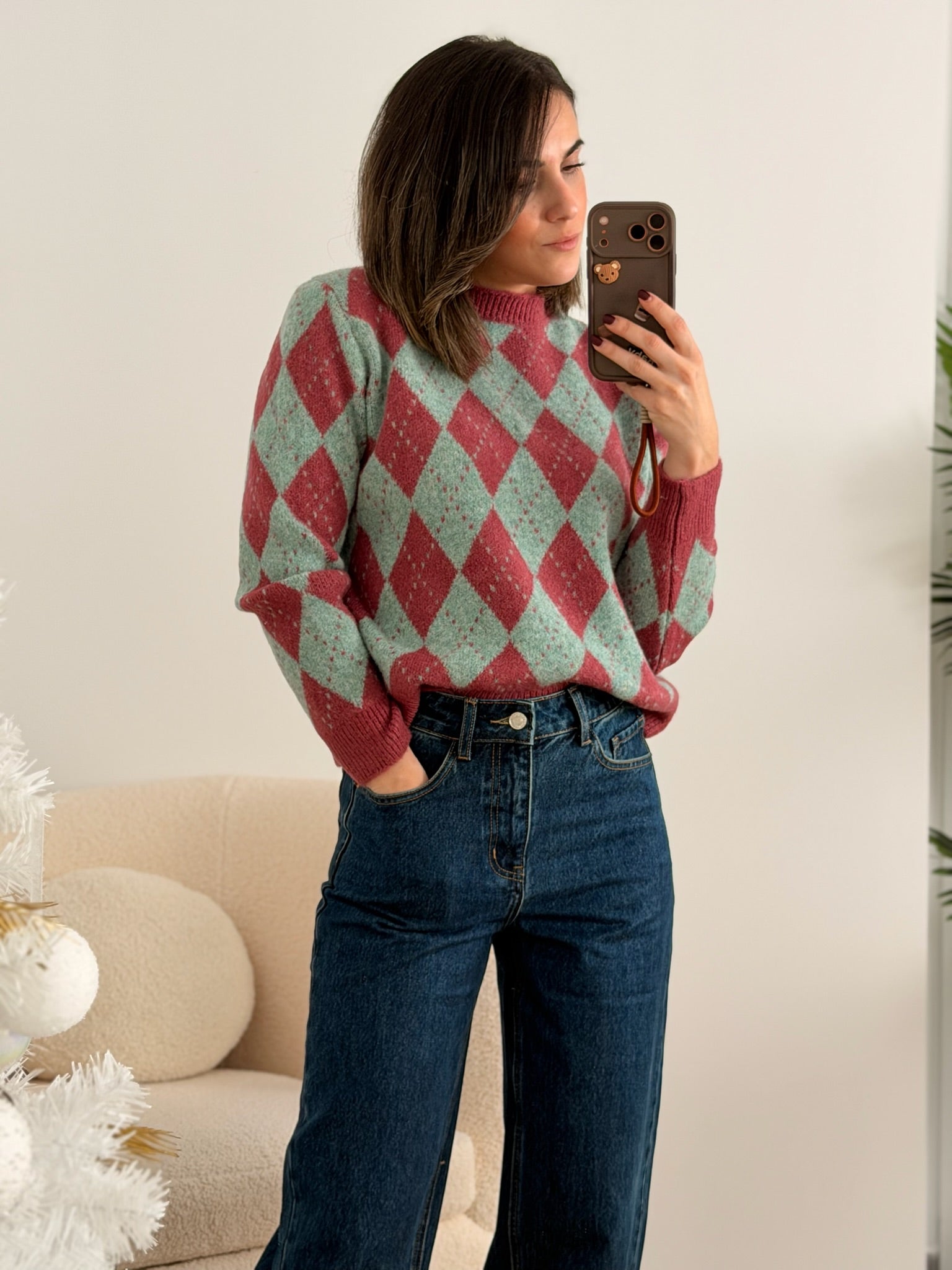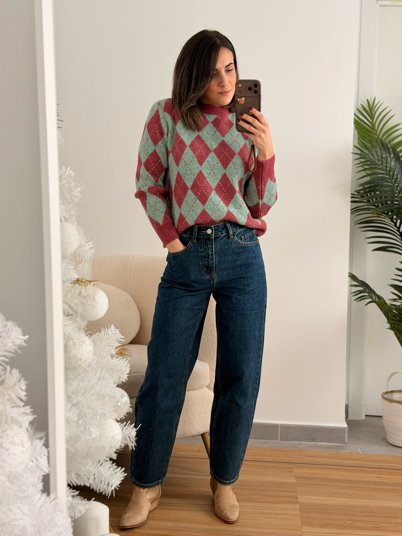 Jersey de punto suave con estampado clásico de rombos estilo argyle en gris y rosa, una combinación vibrante que aporta luz y alegría a cualquier look. Su diseño de corte cómodo y ligeramente relajado lo convierte en una prenda perfecta para el día a día, aportando un toque preppy y actual.