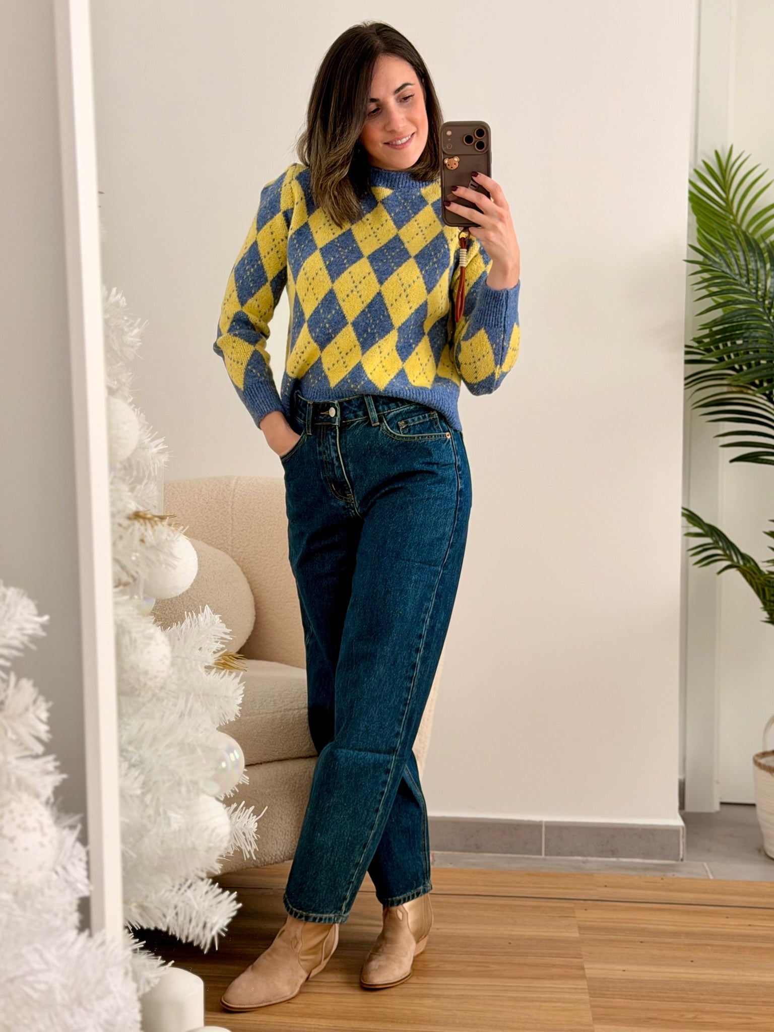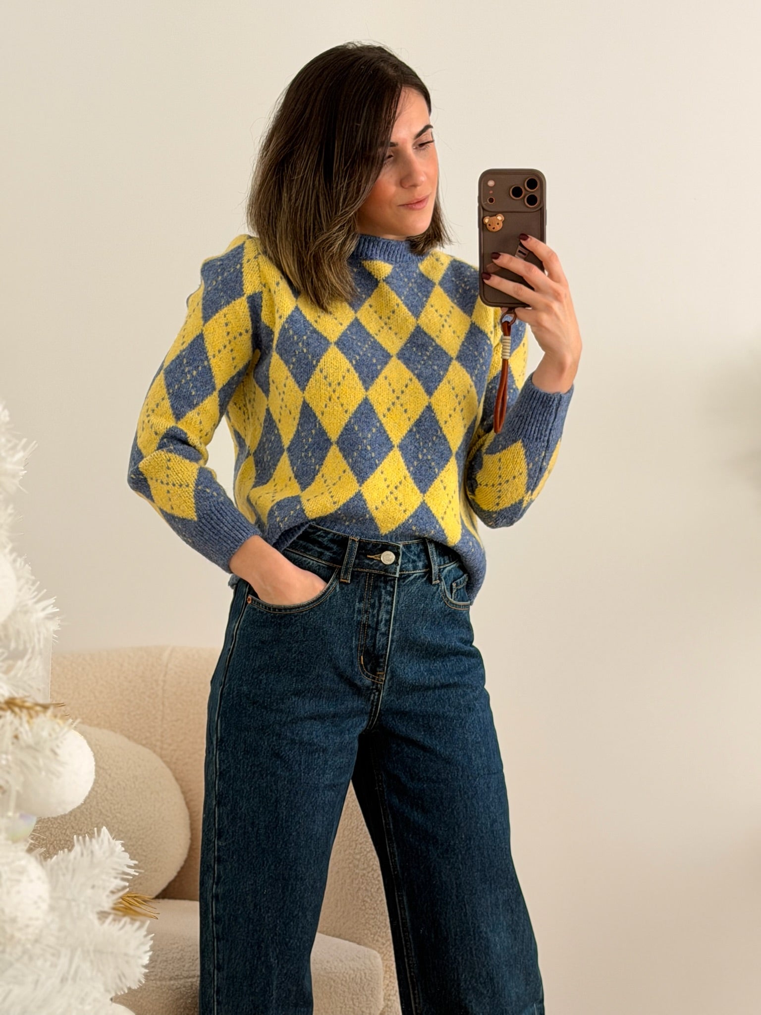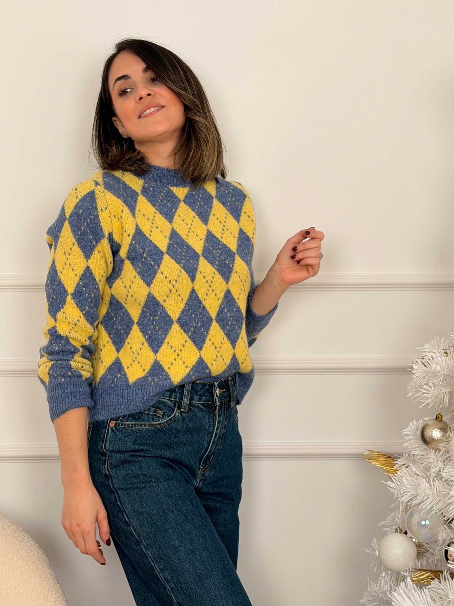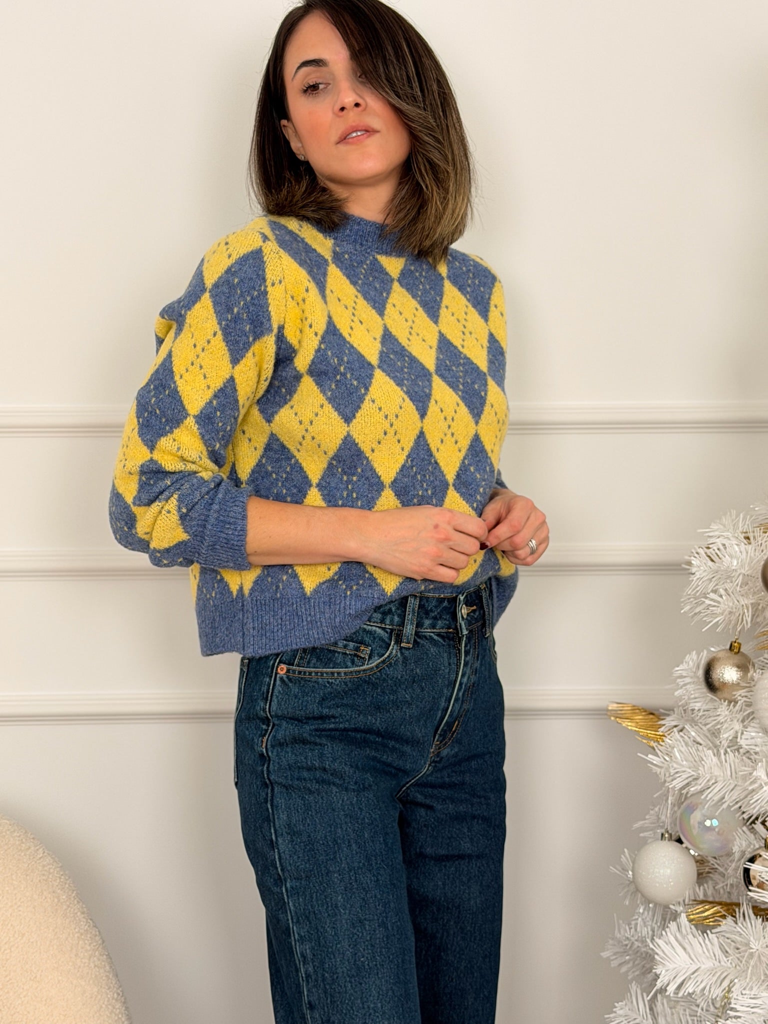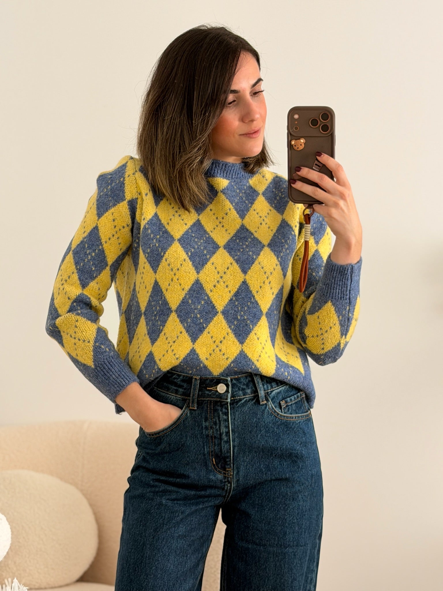 Jersey de punto suave con estampado clásico de rombos estilo argyle en amarillo y azul, una combinación vibrante que aporta luz y alegría a cualquier look. Su diseño de corte cómodo y ligeramente relajado lo convierte en una prenda perfecta para el día a día, aportando un toque preppy y actual.