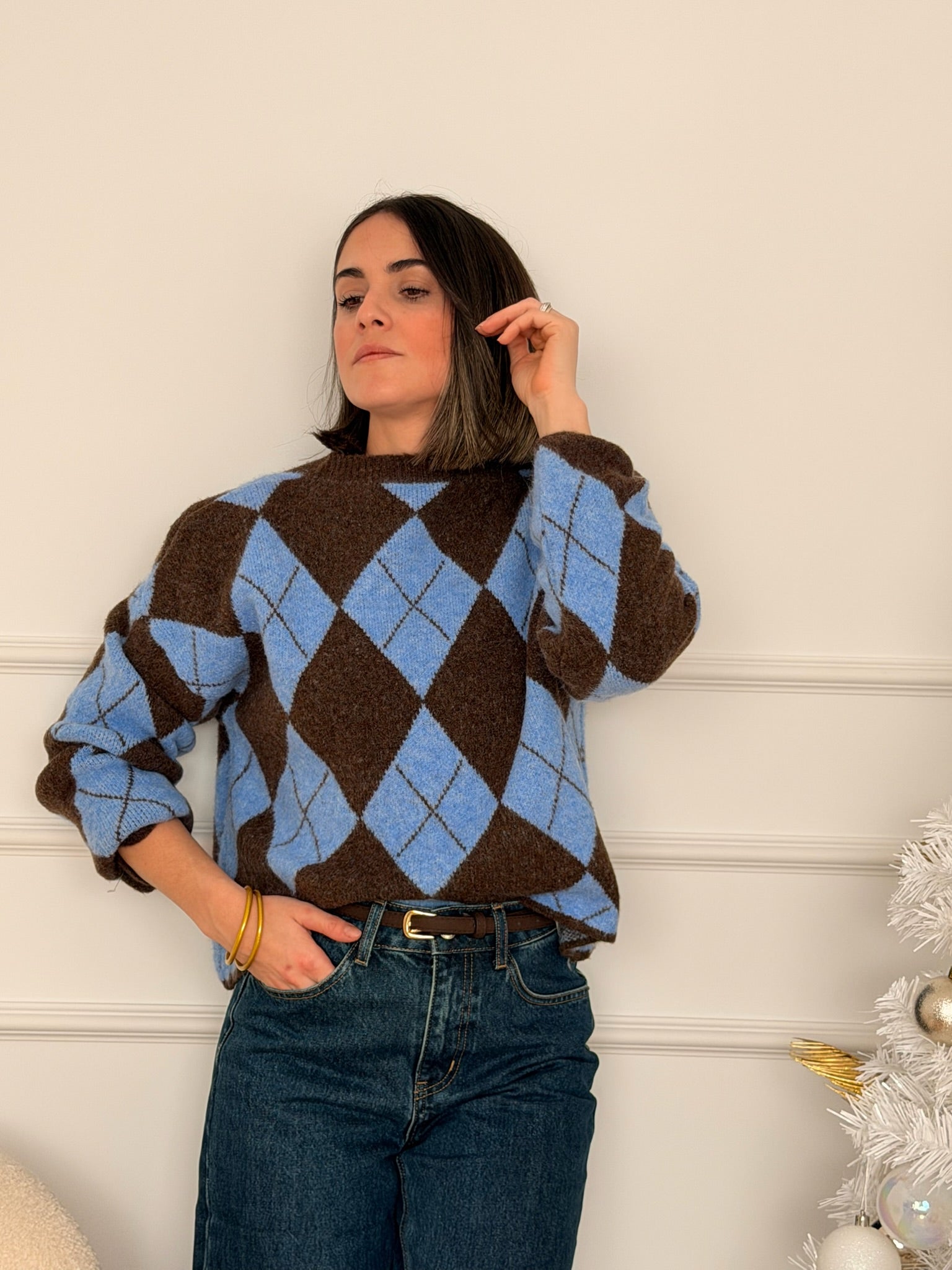 Jersey de punto suave con estampado clásico de rombos estilo argyle en marrón y azul, una combinación vibrante que aporta luz y alegría a cualquier look. Su diseño de corte cómodo y ligeramente relajado lo convierte en una prenda perfecta para el día a día, aportando un toque preppy y actual.