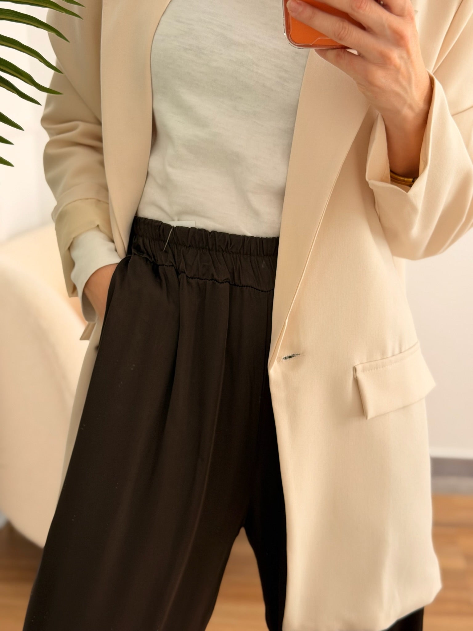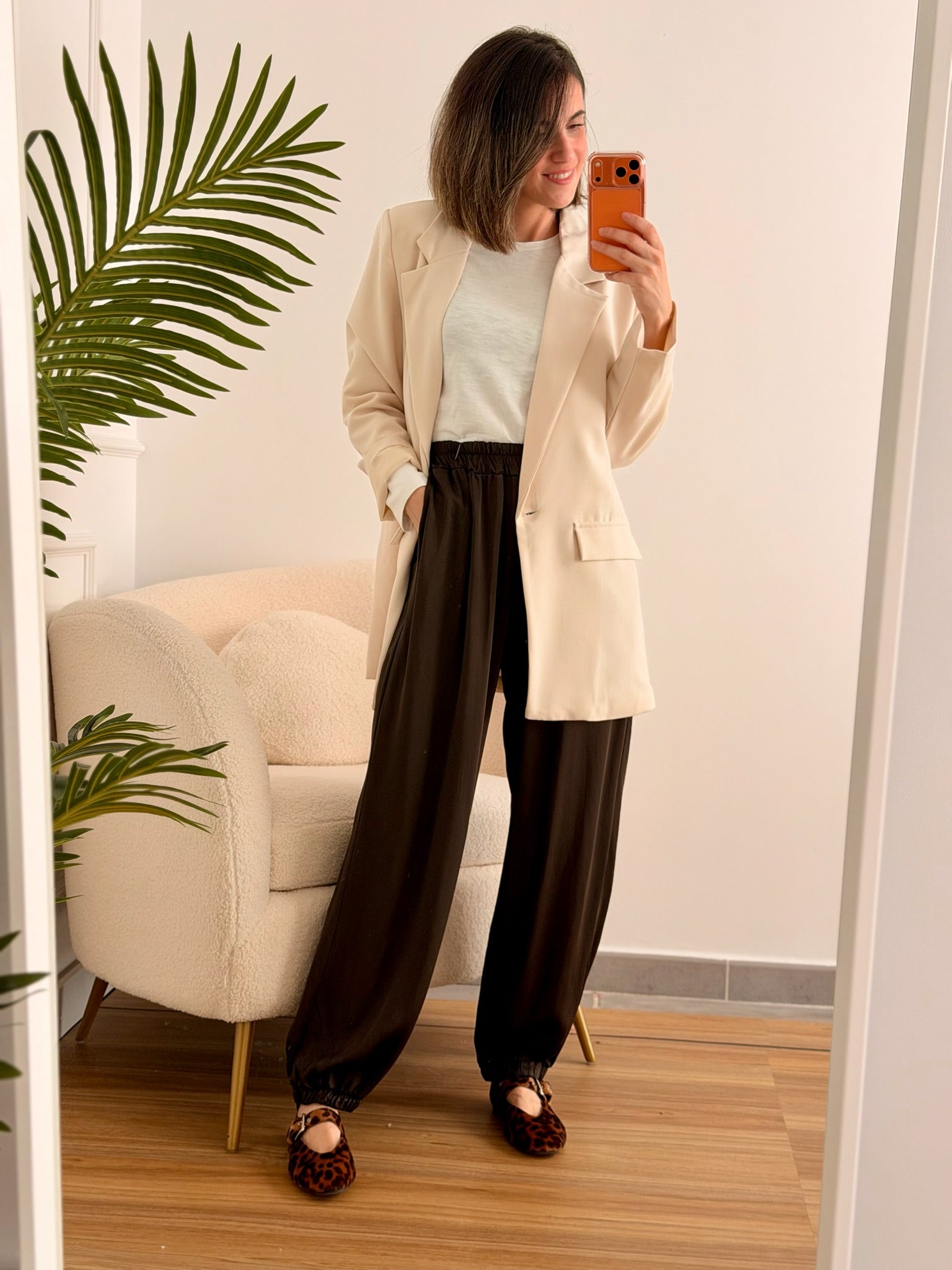 Añade un toque de estilo effortless a tu armario con este pantalón bombacho de acabado satinado, ligero, fluido y con caída elegante. Cuenta con goma elástica en la cintura para un ajuste cómodo y favorecedor, adaptándose a diferentes siluetas. El bajo también lleva goma para crear ese efecto abullonado que marca tendencia. Ideal para combinar con blazers, camisas o tops ajustados. ¡Versátil, cómodo y muy chic!