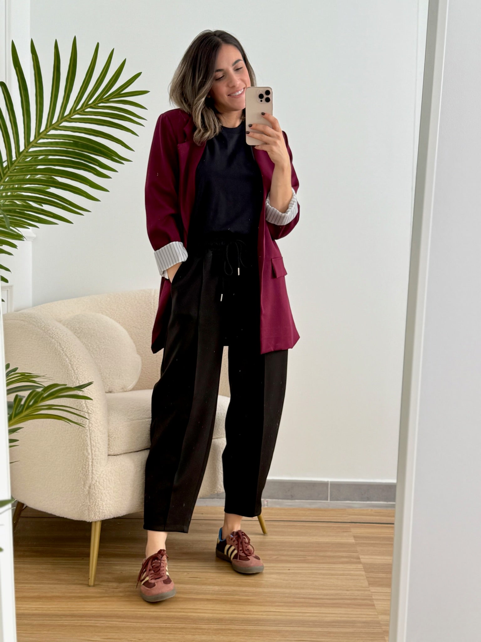 Su color negro lo convierte en una prenda muy combinable: va con todo y siempre aporta luz. Llévalo con sudaderas, camisas amplias o incluso una blazer para un look más elevado.
