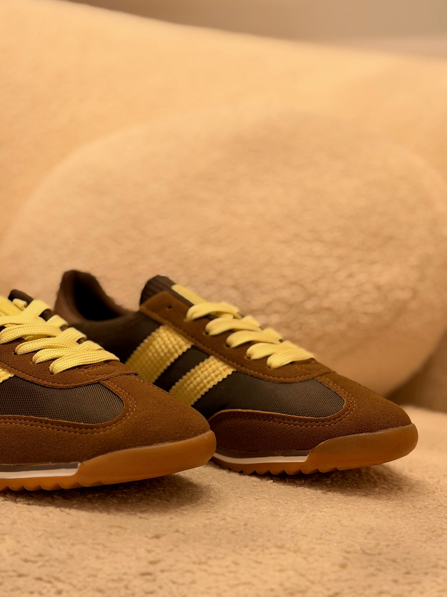 Zapatillas estilo retro runner en tonos marrón y beige, perfectas para elevar tus looks casuales sin renunciar a la comodidad. Combinan tejido técnico con detalles en serraje y bandas laterales en contraste, creando un diseño actual con inspiración vintage.