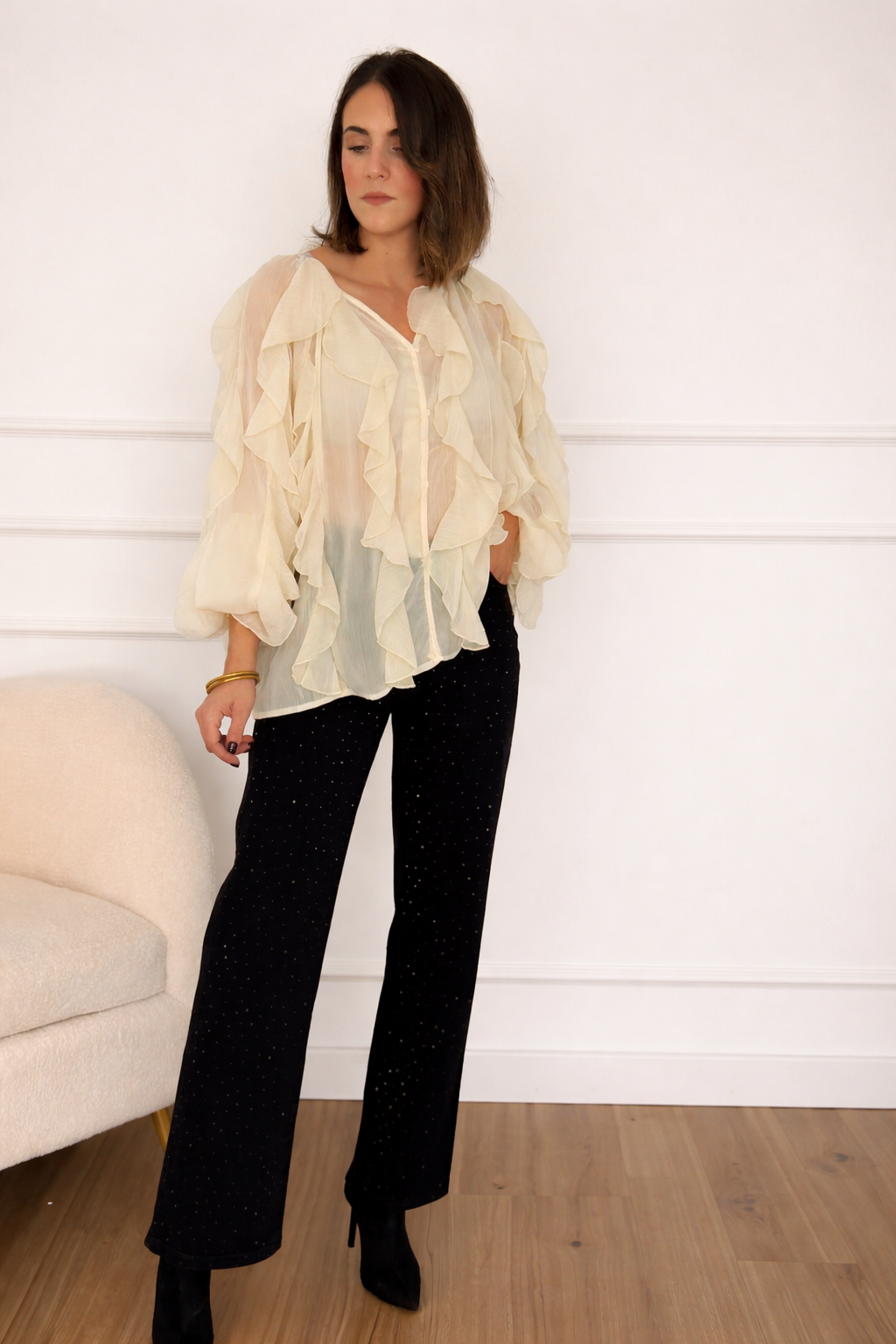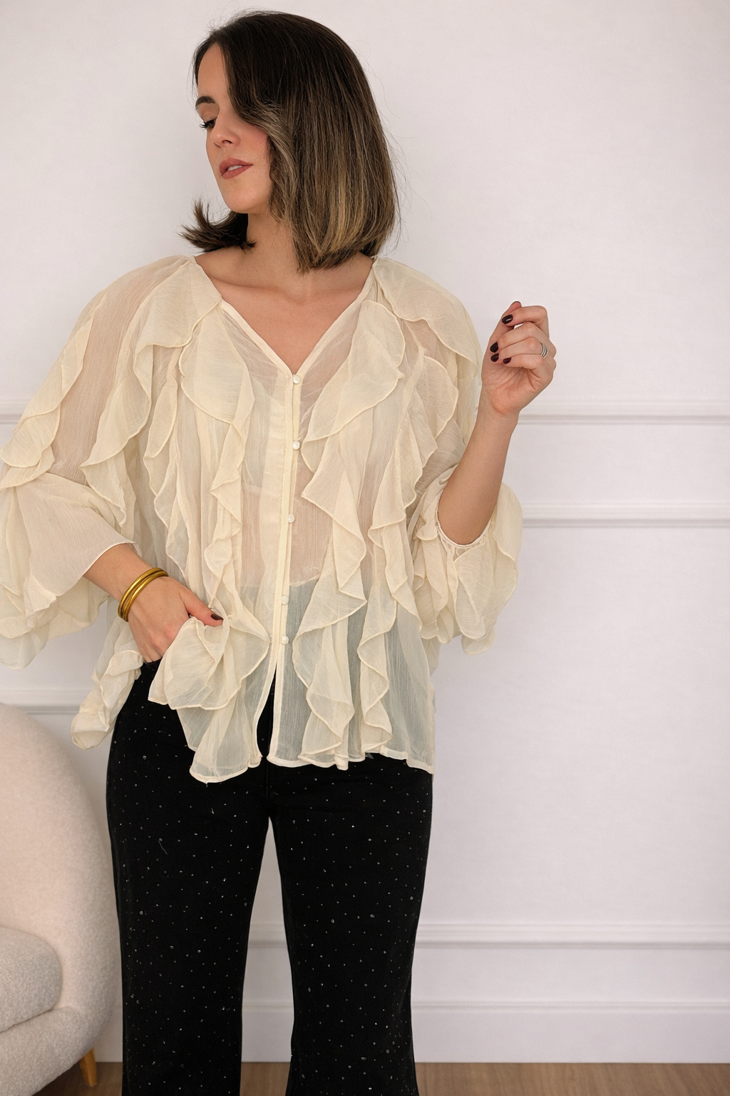 Delicada, ligera y con ese toque romántico que eleva cualquier look. Esta blusa fluida en tono crudo destaca por sus volantes en cascada, el tejido semitransparente y sus pequeños botones forrados. Ideal para las celebraciones de Navidad, cenas especiales o cualquier evento en el que quieras sentirte arreglada sin renunciar a la comodidad.