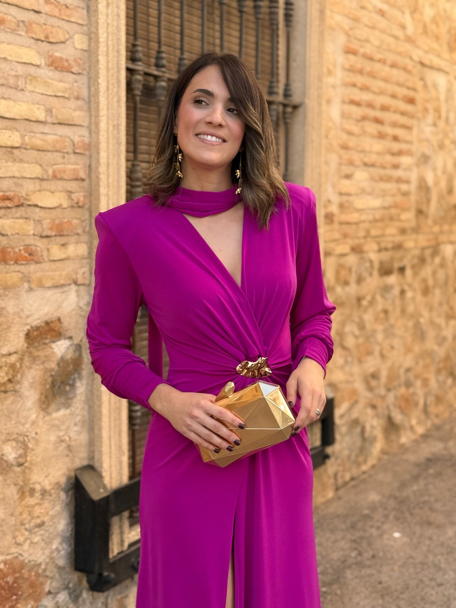 Su detalle protagonista es el broche dorado en el centro, que frunce el tejido creando un efecto favorecedor en la cintura, junto con la abertura en la falda que aporta movimiento y sensualidad.
