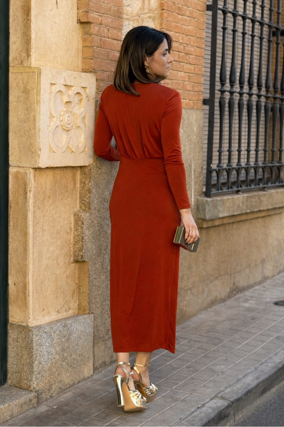 Nuestro vestido midi terracota es la elección perfecta para invitadas que buscan un look elegante, favorecedor y atemporal. Tejido en punto de seda. Su diseño con escote en V, manga larga y frunce en la cintura estiliza la silueta, aportando un efecto moldeador muy favorecedor.