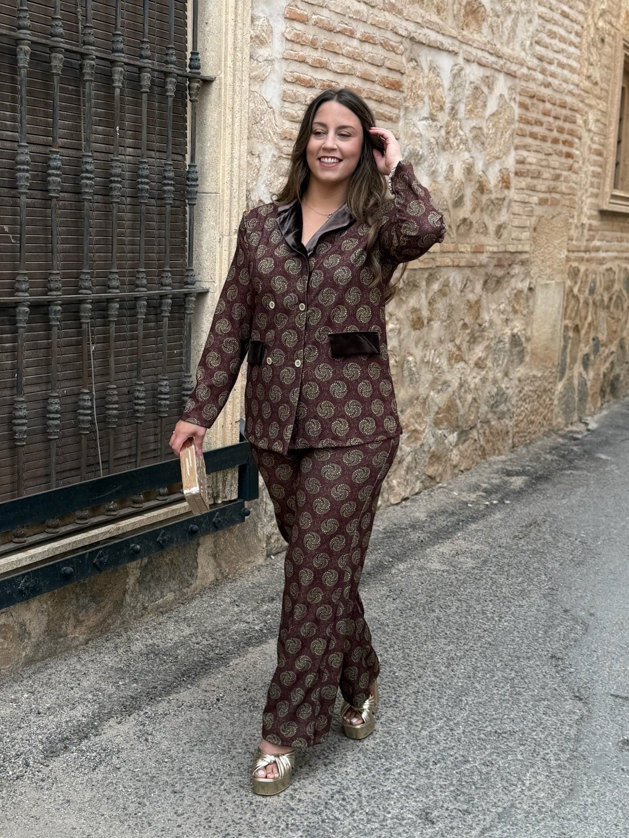 La blazer presenta solapas y bolsillos en terciopelo marrón, aportando un contraste lujoso y femenino, mientras que el pantalón fluido alarga la silueta y ofrece máxima comodidad.