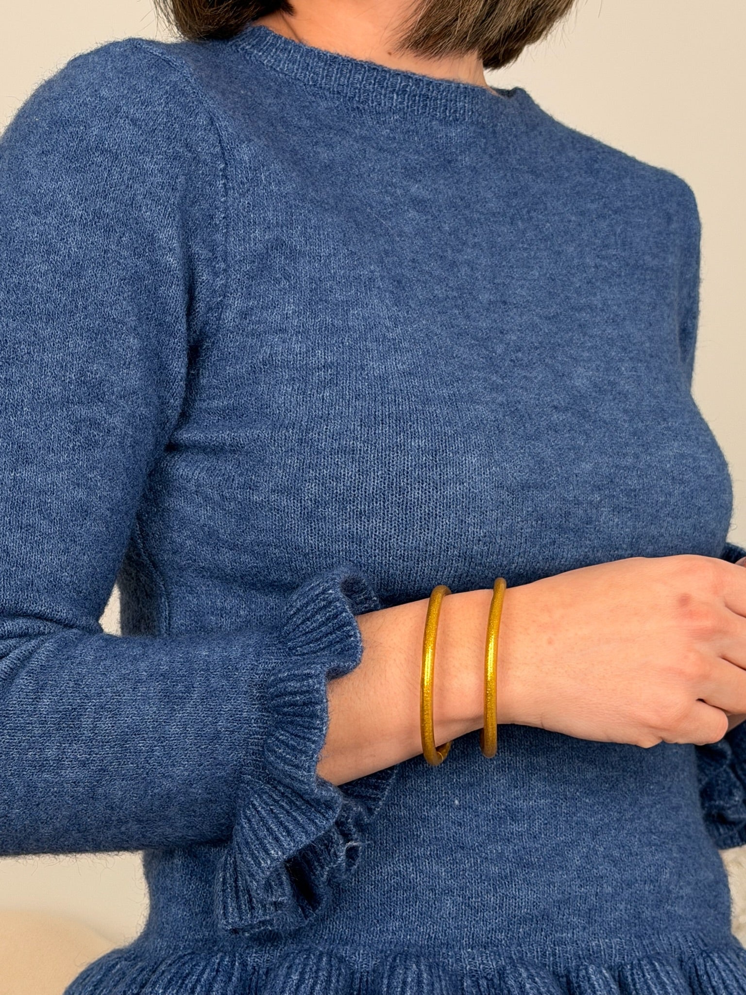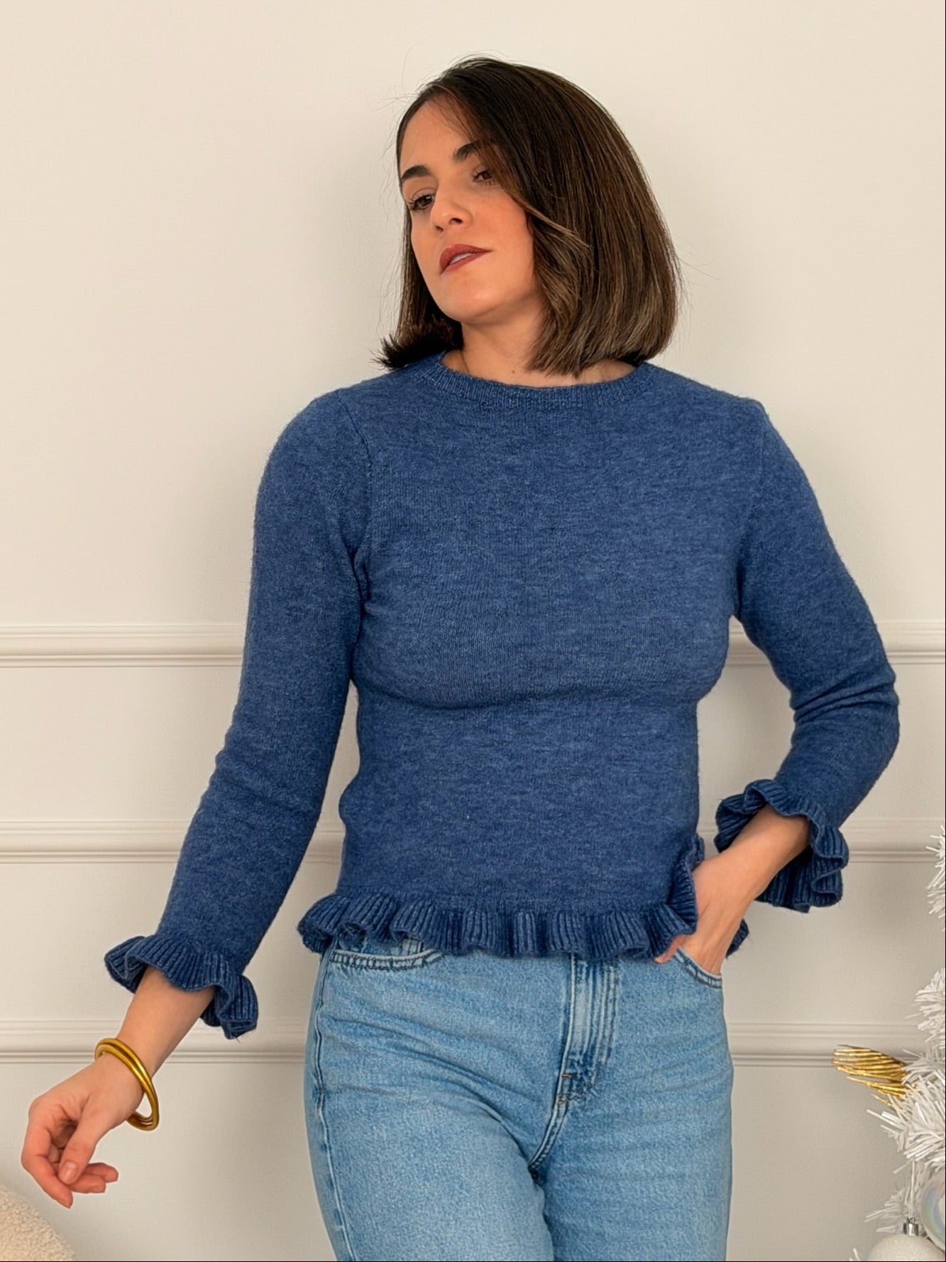 Jersey de punto suave y gustoso, con un acabado ligeramente afelpado que lo hace muy agradable al tacto. Destaca por su detalle ondulado en puños y bajo, que le aporta un aire femenino y especial sin perder comodidad.