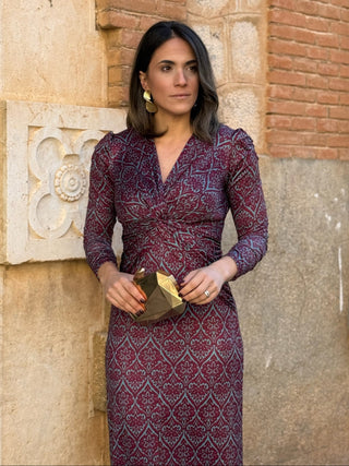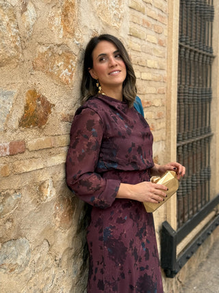 👉 Ejemplo: Vestido buganvilla + bolso dorado + pendientes a juego.