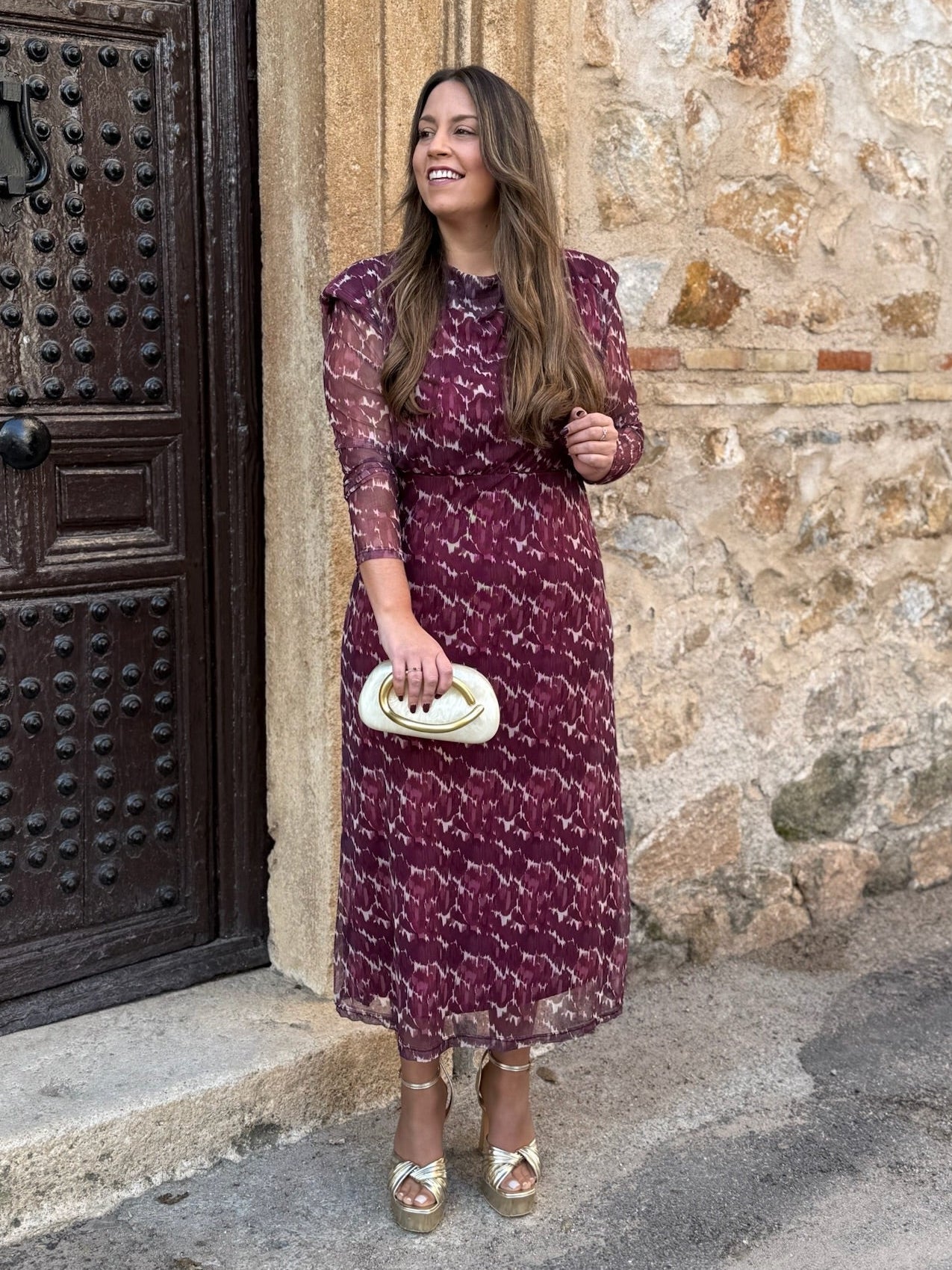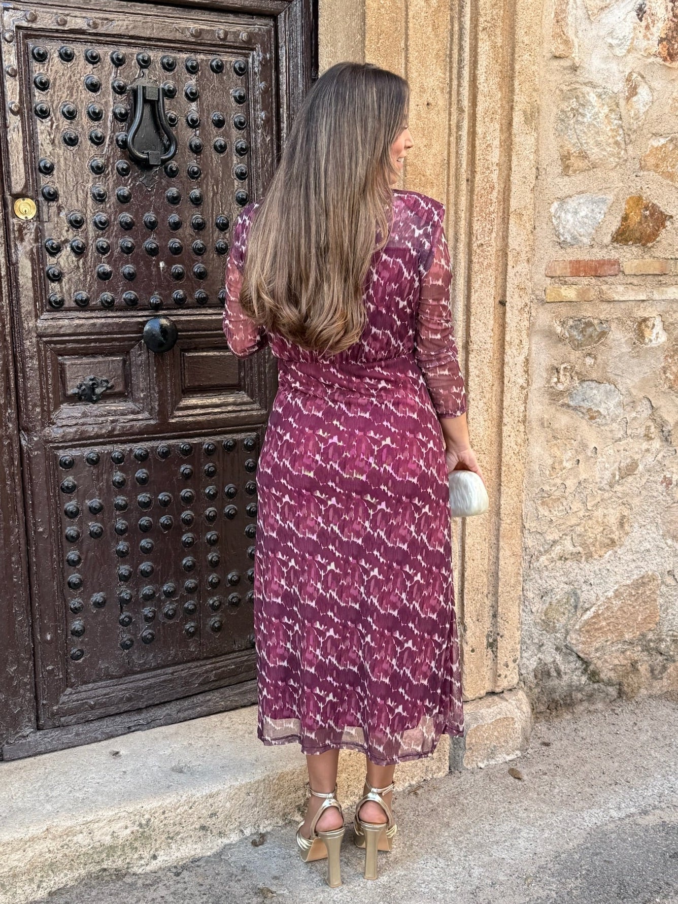 Su diseño combina delicadeza y personalidad, con un estampado en tonos vino y nude perfecto para invitadas de otoño. Ideal para bodas de día, comuniones o eventos especiales, podrás completarlo con accesorios dorados para un look sofisticado y luminoso.